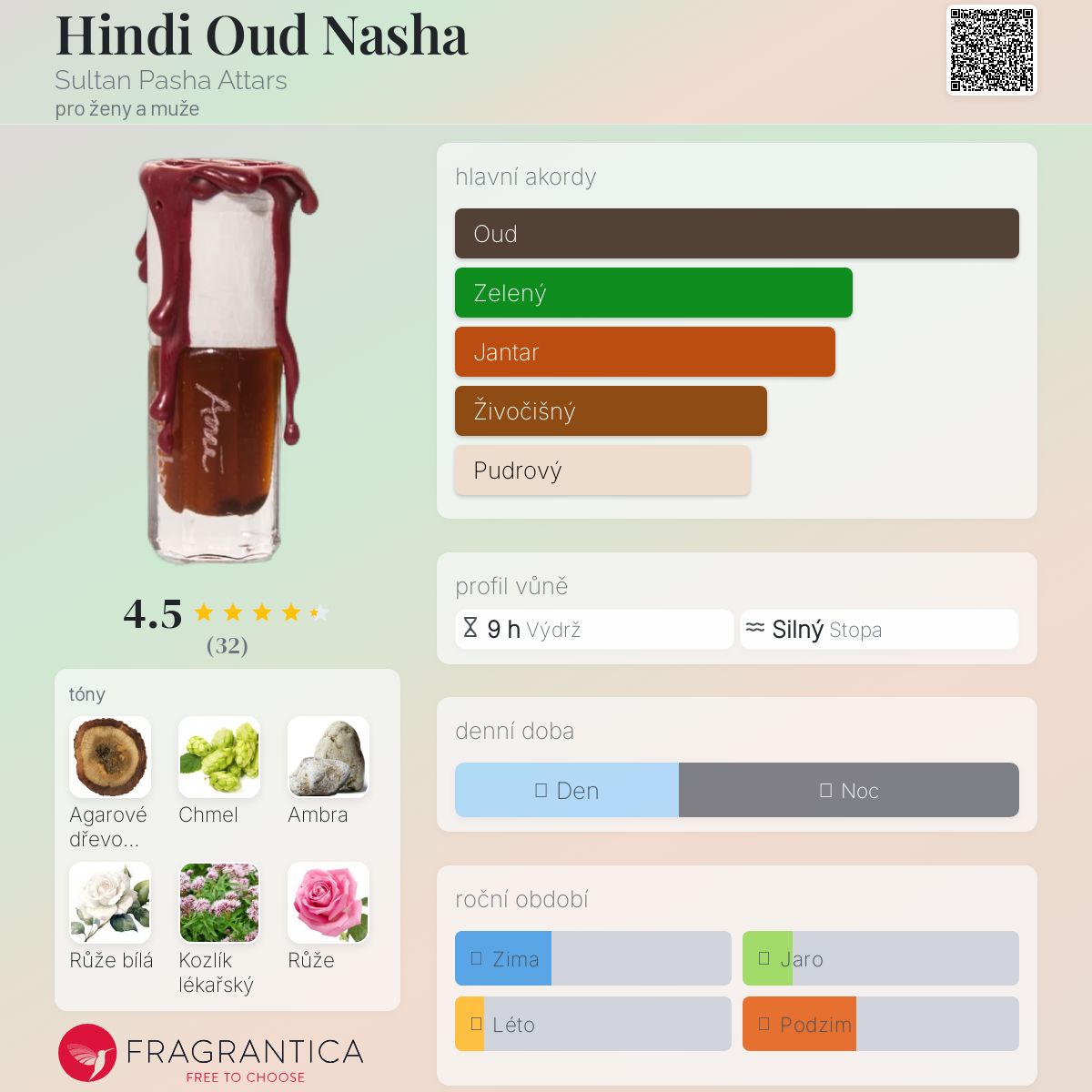 Hindi Oud Nasha podle Sultan Pasha Attars je Floral Woody Musk vůně pro ženy a muže. Hindi Oud Nasha byl/a uveden/a v roce 2022. Vrchní tóny jsou Chmel, Růže bílá a Bulharská růže; střední tóny jsouChmel, Růže de Mai, Růže, Orris, Fialkový list a Mimóza ; základní tóny jsou Agarové dřevo (oud), Ambra, Černý jantar, Kozlík lékařský, Orris, Pižmo, Siamský (thajský) benzoin a Himalájský cedr.