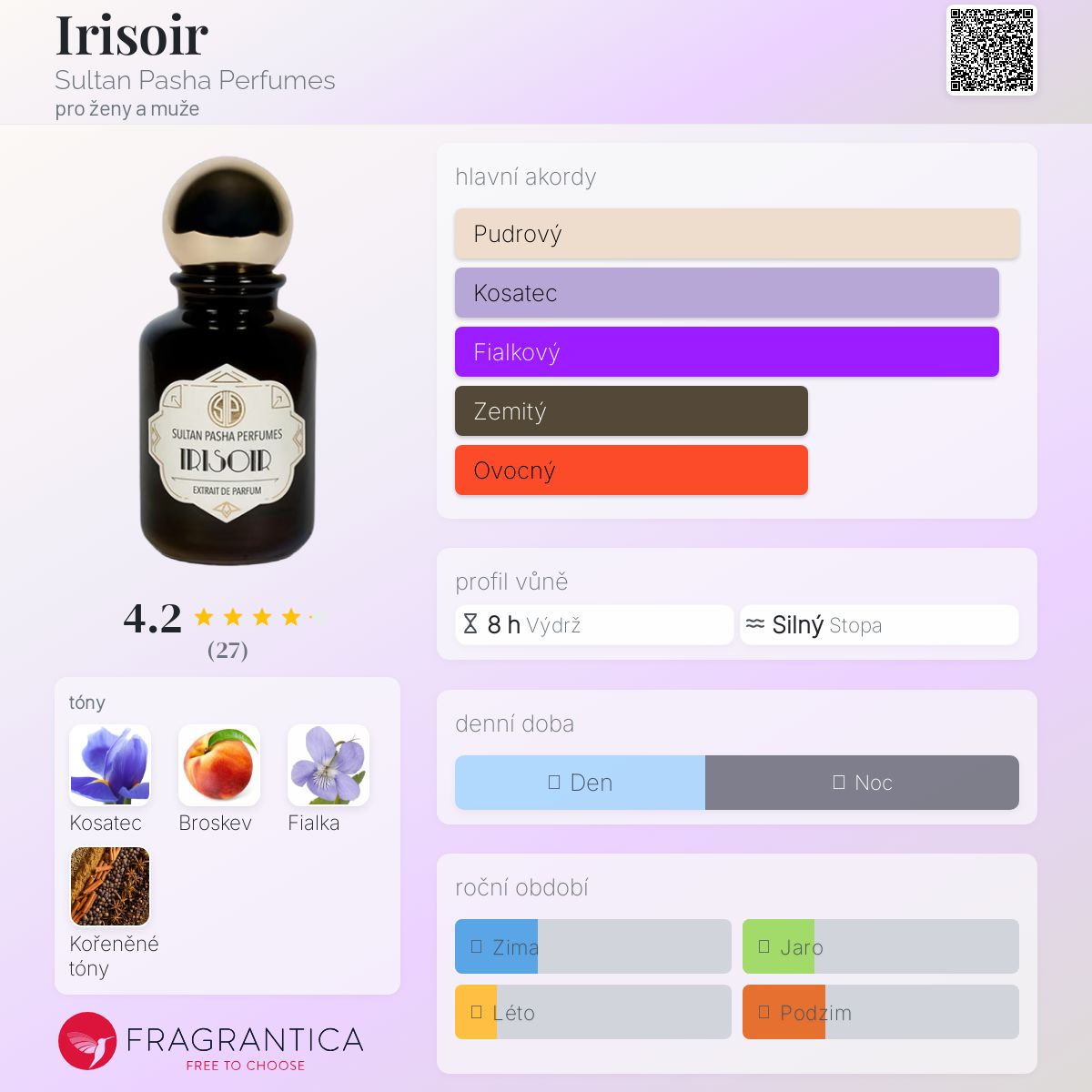 Irisoir podle Sultan Pasha Perfumes je Floral vůně pro ženy a muže. Toto je nová vůně. Irisoir byl/a uveden/a v roce 2025. Irisoir byl/a vytvořen/a Sultan Pasha a Christian Carbonnel. Vrchní tóny jsou Kosatec, Broskev, Fialka, Otočník a Šeřík; střední tóny jsouKosatcové máslo, Orris, Karafiát, Tuberóza, Jasmín, Růže a Fialkový list ; základní tóny jsou Ambra, Styrax, Fazole tonka, Santalové dřevo Mysore, Cedr, Haitský vetiver, Kosatcové máslo a Pižmo.