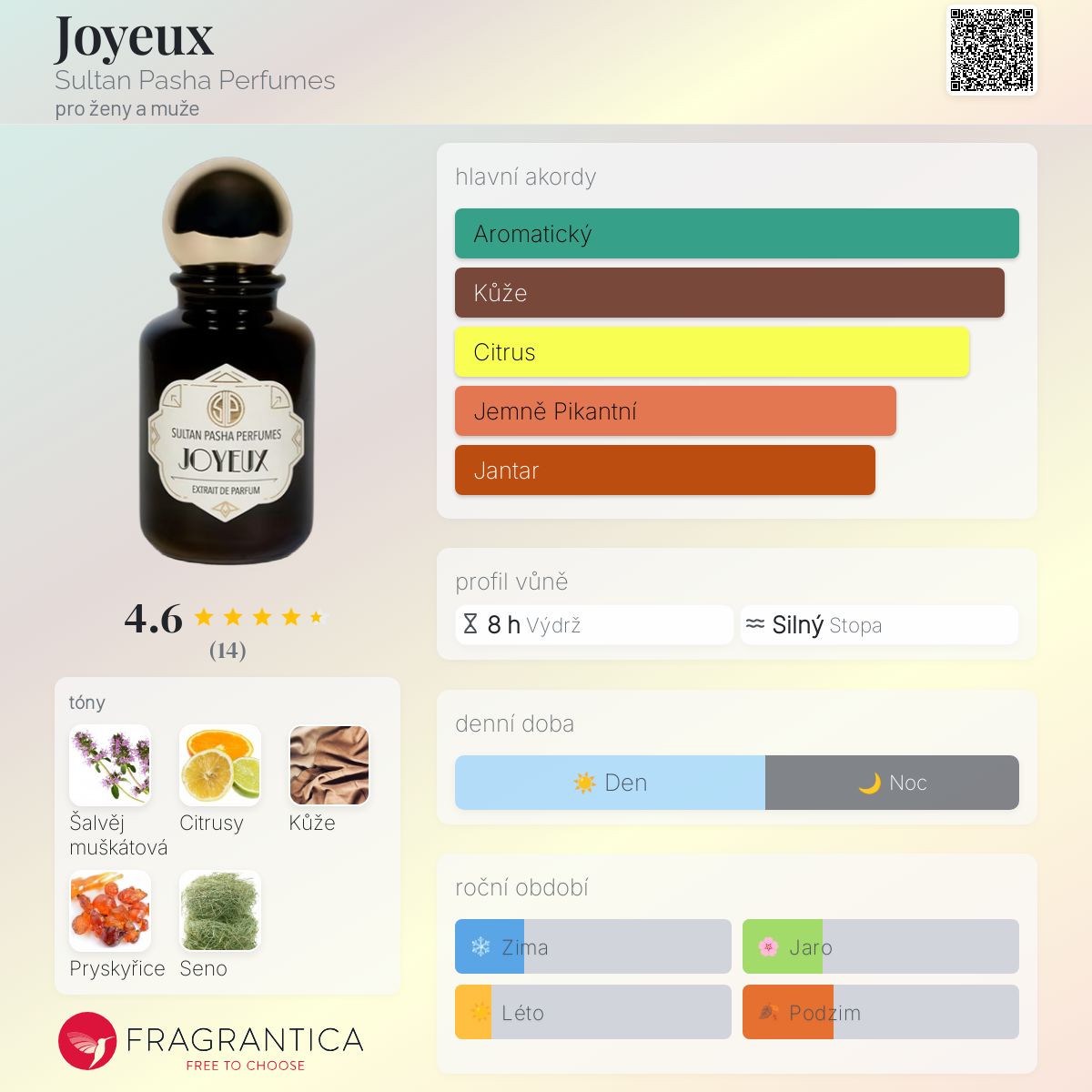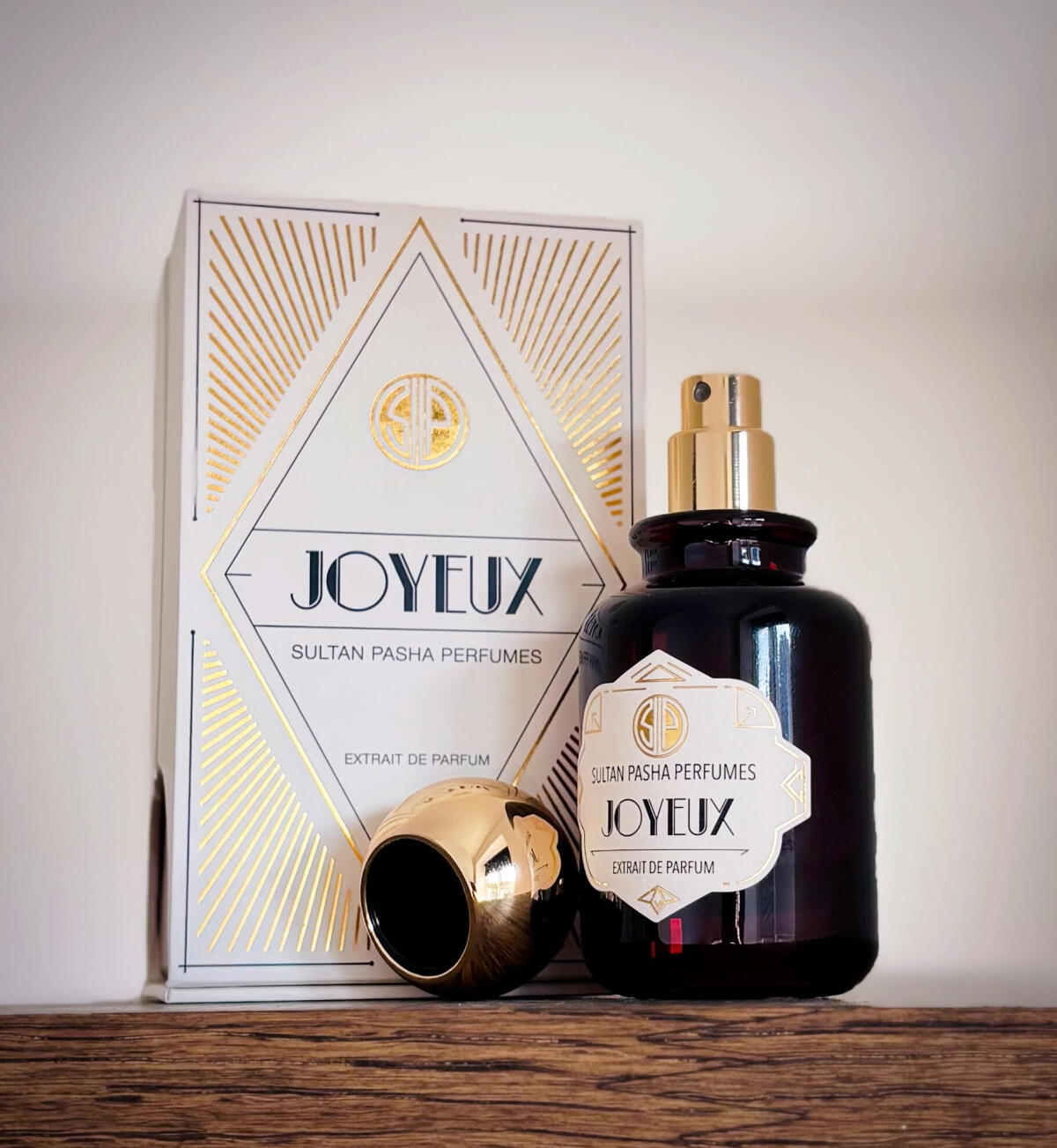 Joyeux podle Sultan Pasha Perfumes je Aromatic Fougere vůně pro ženy a muže. Toto je nová vůně. Joyeux byl/a uveden/a v roce 2025. Joyeux byl/a vytvořen/a Sultan Pasha a Christian Carbonnel. Vrchní tóny jsou Levandulový extrakt, Levandule, Bergamot a Máta; střední tóny jsouŠalvěj muškátová, Levandule, Jasmín a Konvalinka ; základní tóny jsou Kůže, Mousse de Saxe, Fazole tonka, Santalové dřevo Mysore, Pačuli, Vetiver, Cedr, Siamský (thajský) benzoin, Opoponax, Ambra, Pižmo a Mořská řasa.