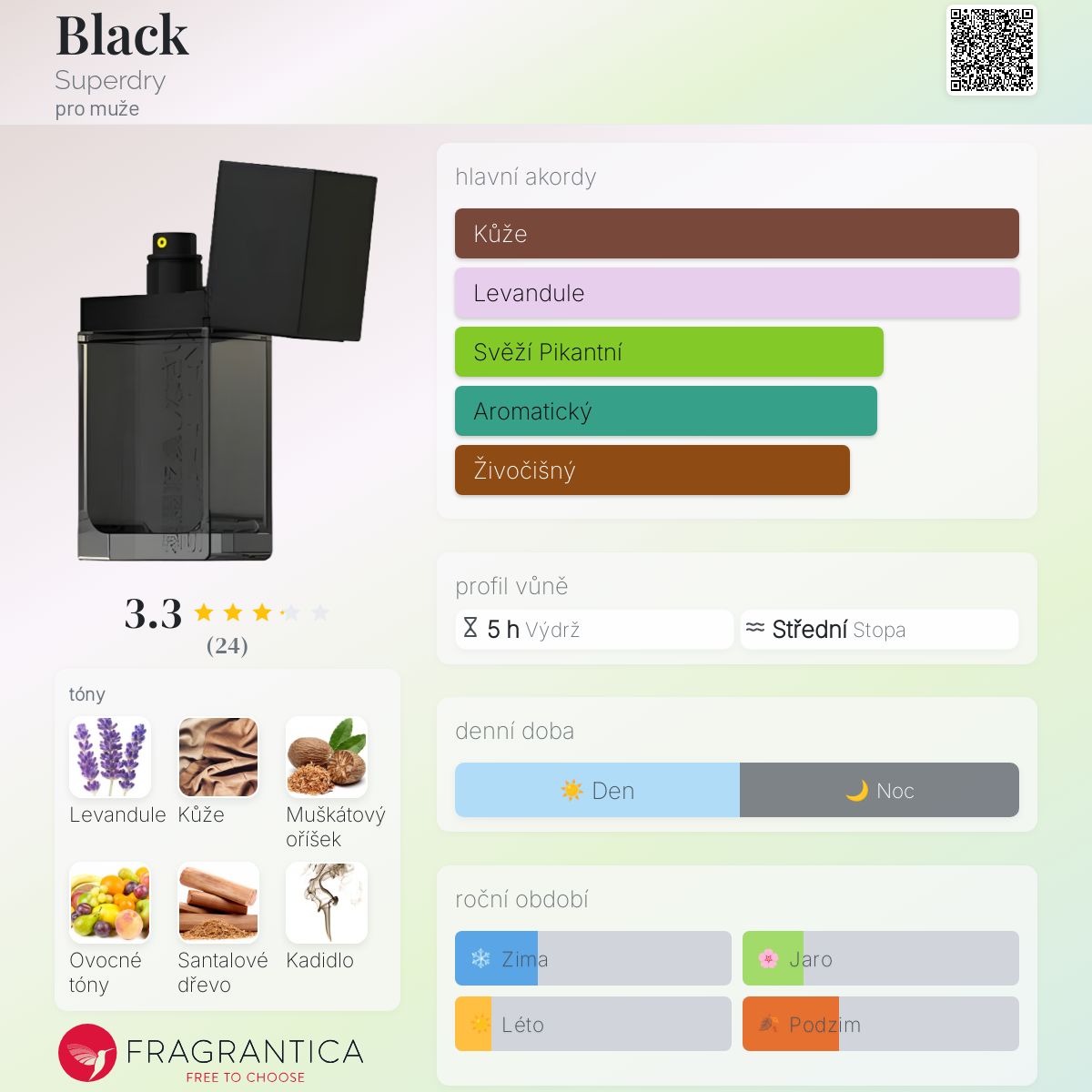 Black podle Superdry je Orientální Fougere vůně pro muže. Black byl/a uveden/a v roce 2011. Vrchní tóny jsou Ovocné tóny a Limetka; střední tóny jsouLevandule, Muškátový oříšek, Koriandr, Tymián a Jasmín ; základní tóny jsou Kůže, Santalové dřevo, Kadidlo, Pryskyřice a Dubový mech.