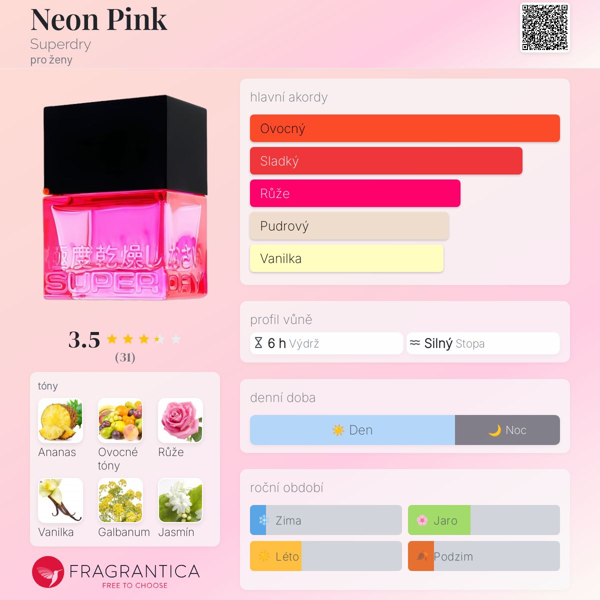 Neon Pink podle Superdry je Orientální Floral vůně pro ženy. Neon Pink byl/a uveden/a v roce 2013. Vrchní tóny jsou Ananas, Galbanum a Bergamot; střední tóny jsouOvocné tóny, Růže a Jasmín ; základní tóny jsou Vanilka, Pižmo a Santalové dřevo.