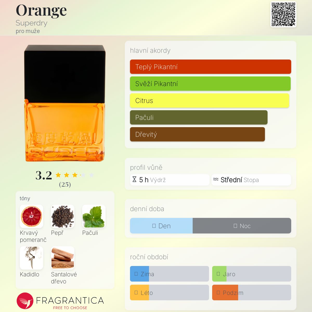 Orange podle Superdry je Orientální Woody vůně pro muže. Orange byl/a uveden/a v roce 2012. Vrchní tóny jsou Krvavý pomeranč a Kadidlo; střední tón jeČerný pepř ; základní tóny jsou Pačuli a Santalové dřevo.