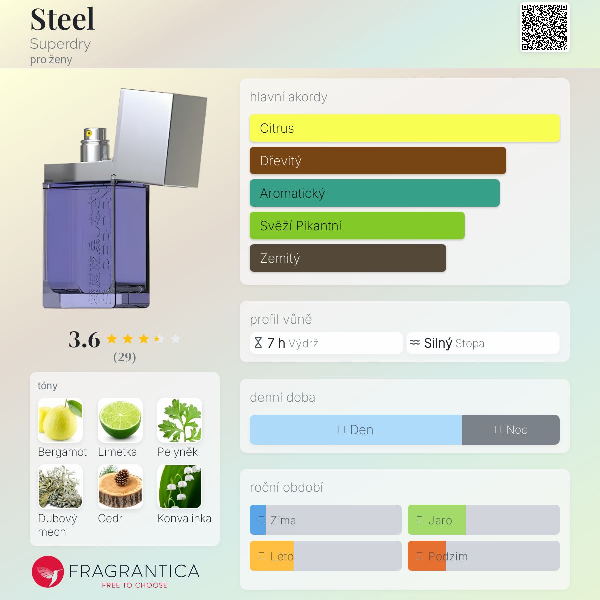 Steel podle Superdry je Woody Chypre vůně pro ženy. Steel byl/a uveden/a v roce 2011. Vrchní tóny jsou Bergamot, Limetka a Aldehydy; střední tóny jsouPelyněk, Konvalinka, Kardamom a Fialkový list ; základní tóny jsou Dubový mech, Virginský cedr, Vetiver a Pačuli.