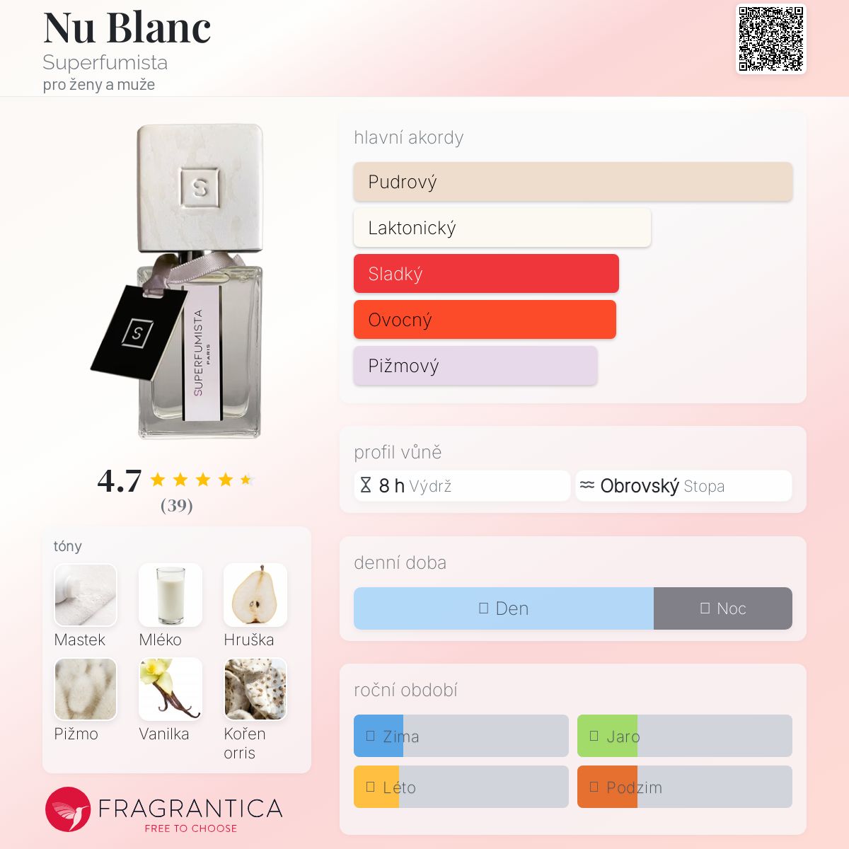Nu Blanc podle Superfumista je Floral Woody Musk vůně pro ženy a muže. Toto je nová vůně. Nu Blanc byl/a uveden/a v roce 2024. "Nosem" za touto vůní je Benjamin Sachs. Vrchní tóny jsou Mastek a Hruška; střední tóny jsouMléko a Kořen orris ; základní tóny jsou Bílé pižmo a Vanilka.