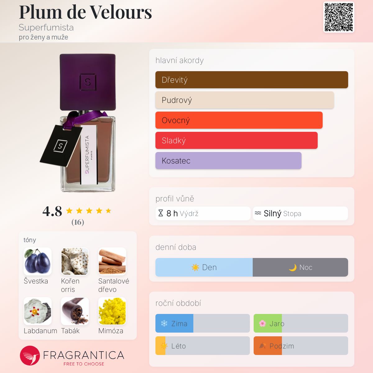Plum de Velours podle Superfumista je Floral Fruity vůně pro ženy a muže. Toto je nová vůně. Plum de Velours byl/a uveden/a v roce 2025. "Nosem" za touto vůní je Benjamin Sachs. Vrchní tóny jsou Kardamom, Bergamot a Petitgrain; střední tóny jsouSušené švestky, Orris a Mimóza ; základní tóny jsou Santalové dřevo, Labdanum, Tabák a Cedr.