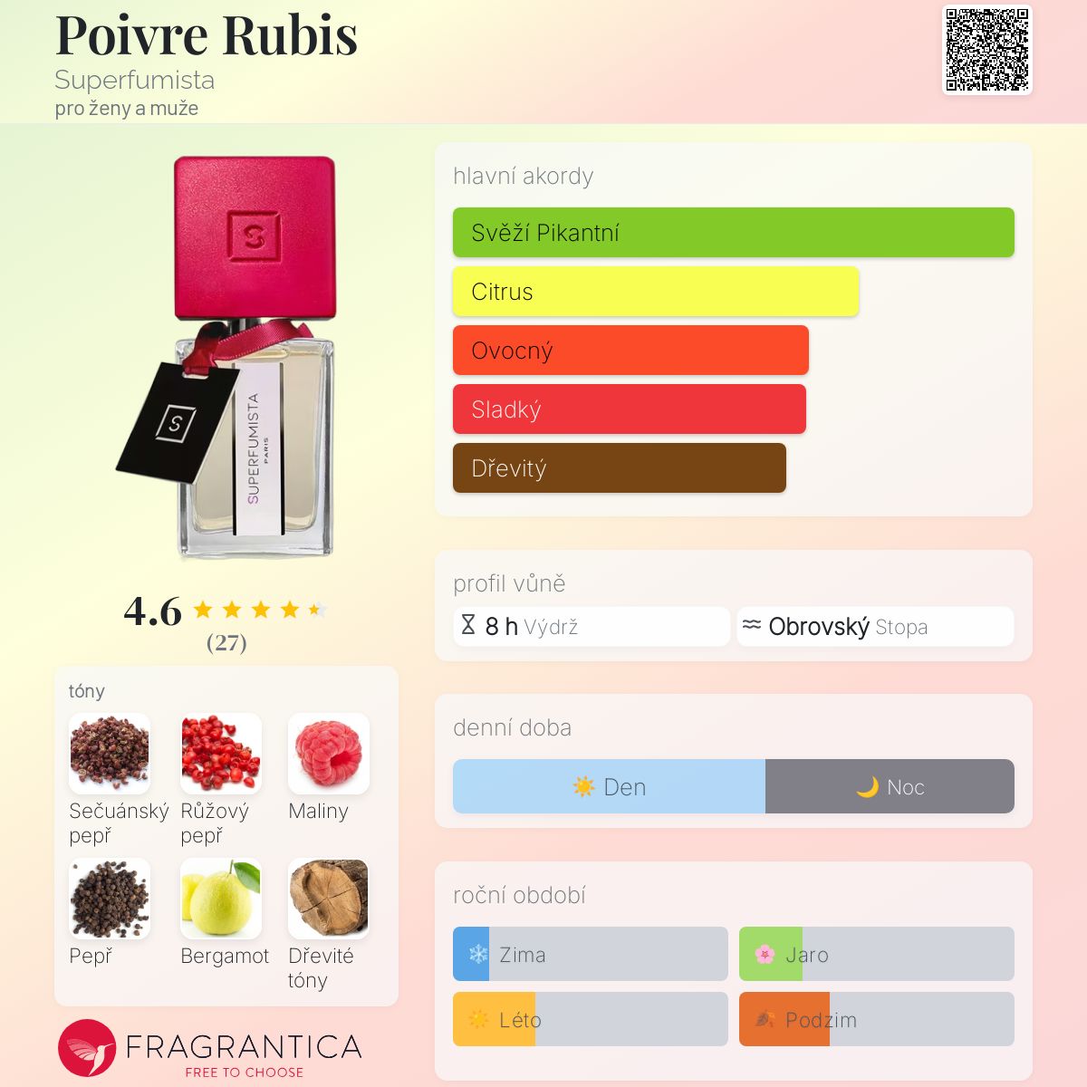 Poivre Rubis podle Superfumista je Woody Spicy vůně pro ženy a muže. Toto je nová vůně. Poivre Rubis byl/a uveden/a v roce 2024. "Nosem" za touto vůní je Benjamin Sachs. Vrchní tóny jsou Sečuánský pepř, Černý pepř a Bergamot; střední tóny jsouSečuánský pepř, Růžový pepř a Maliny ; základní tóny jsou Dřevité tóny, Kadidlo a Kašmír.