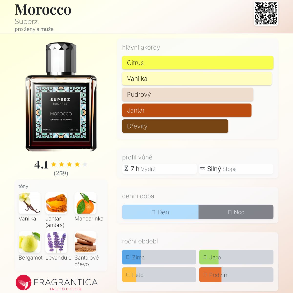 Morocco podle Superz. je Orientální Spicy vůně pro ženy a muže. Morocco byl/a uveden/a v roce 2021. "Nosem" za touto vůní je Hüseyin Erdoğmuş. Vrchní tóny jsou Mandarinka, Bergamot a Aromatické tóny; střední tóny jsouVanilkový květ, Vanilka, Levandule a Frézie ; základní tóny jsou Jantar (ambra), Santalové dřevo, Pižmo a Fazole tonka.