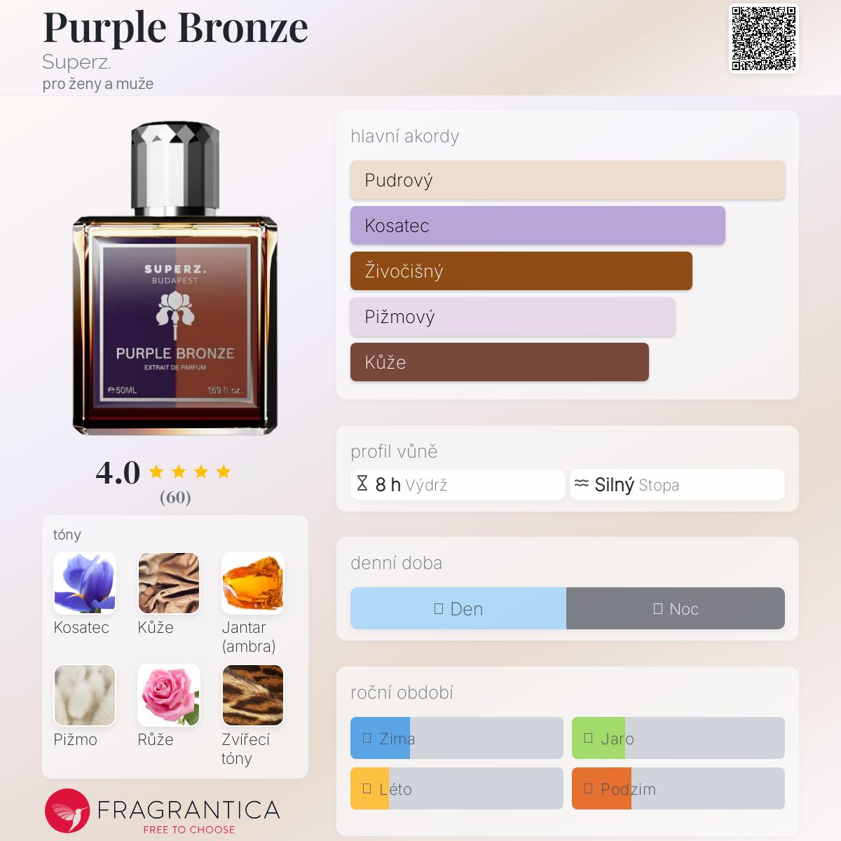 Purple Bronze podle Superz. je Floral vůně pro ženy a muže. Purple Bronze byl/a uveden/a v roce 2022. "Nosem" za touto vůní je Hüseyin Erdoğmuş.