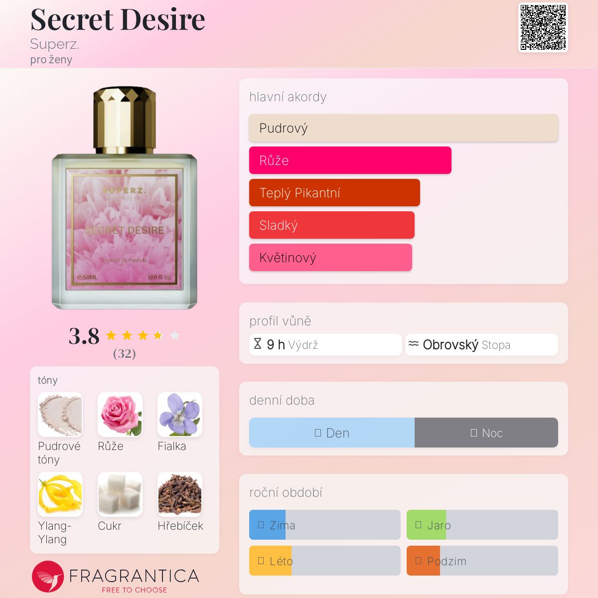 Secret Desire podle Superz. je Floral vůně pro ženy. Secret Desire byl/a uveden/a v roce 2022. "Nosem" za touto vůní je Özge Erdoğmuş Altınel.