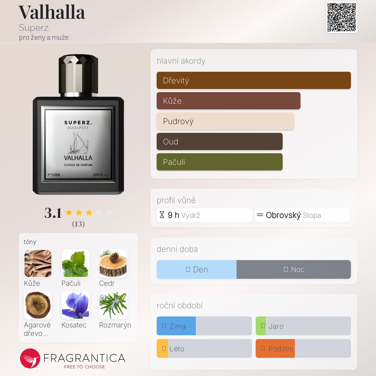 Valhalla podle Superz. je vůně pro ženy a muže. Valhalla byl/a uveden/a v roce 2023. Vrchní tóny jsou Rozmarýn, Fialka a Bergamot; střední tóny jsouKosatec, Jantar (ambra) a Vanilka ; základní tóny jsou Kůže, Agarové dřevo (oud), Pačuli, Cedr a Santalové dřevo.