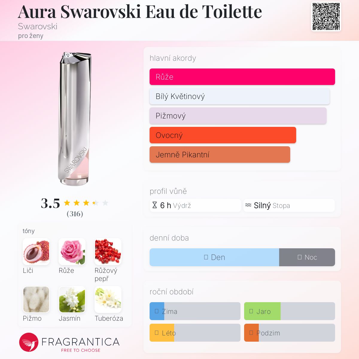 Aura Swarovski Eau de Toilette podle Swarovski je Orientální Floral vůně pro ženy. Aura Swarovski Eau de Toilette byl/a uveden/a v roce 2012. Aura Swarovski Eau de Toilette byl/a vytvořen/a Jean-Pierre Bethouart a Fabrice Pellegrin. Vrchní tón je Liči ; střední tóny jsouRůže, Jasmín a Tuberóza ; základní tóny jsou Růžový pepř, Pižmo, Jantar (ambra) a Benzoin.