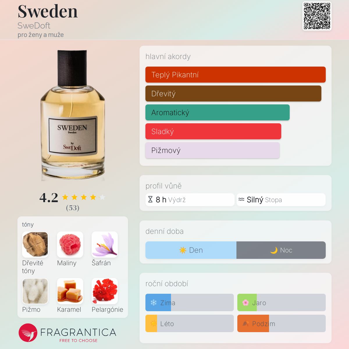 Sweden podle SweDoft je Orientální Spicy vůně pro ženy a muže. Sweden byl/a uveden/a v roce 2022. "Nosem" za touto vůní je Sfean J.A.. Vrchní tóny jsou Šafrán, Pelargónie, Kardamom a Citrón; střední tóny jsouDřevité tóny, Karamel, Vetiver a Pačuli ; základní tóny jsou Maliny, Pižmo, Labdanum a Benzoin.