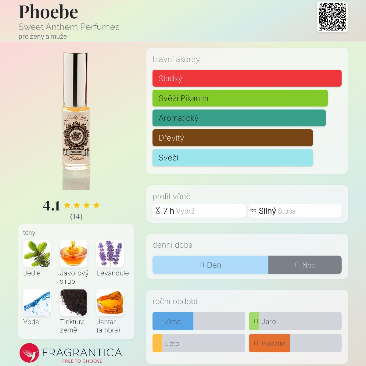 Phoebe podle Sweet Anthem Perfumes je vůně pro ženy a muže. "Nosem" za touto vůní je Meredith Smith. Vrchní tóny jsou Javorová míza a Vodnaté tóny; střední tóny jsouJedle a Levandule ; základní tóny jsou Půdní tinktura, Bílý jantar (ambra) a Tabák.