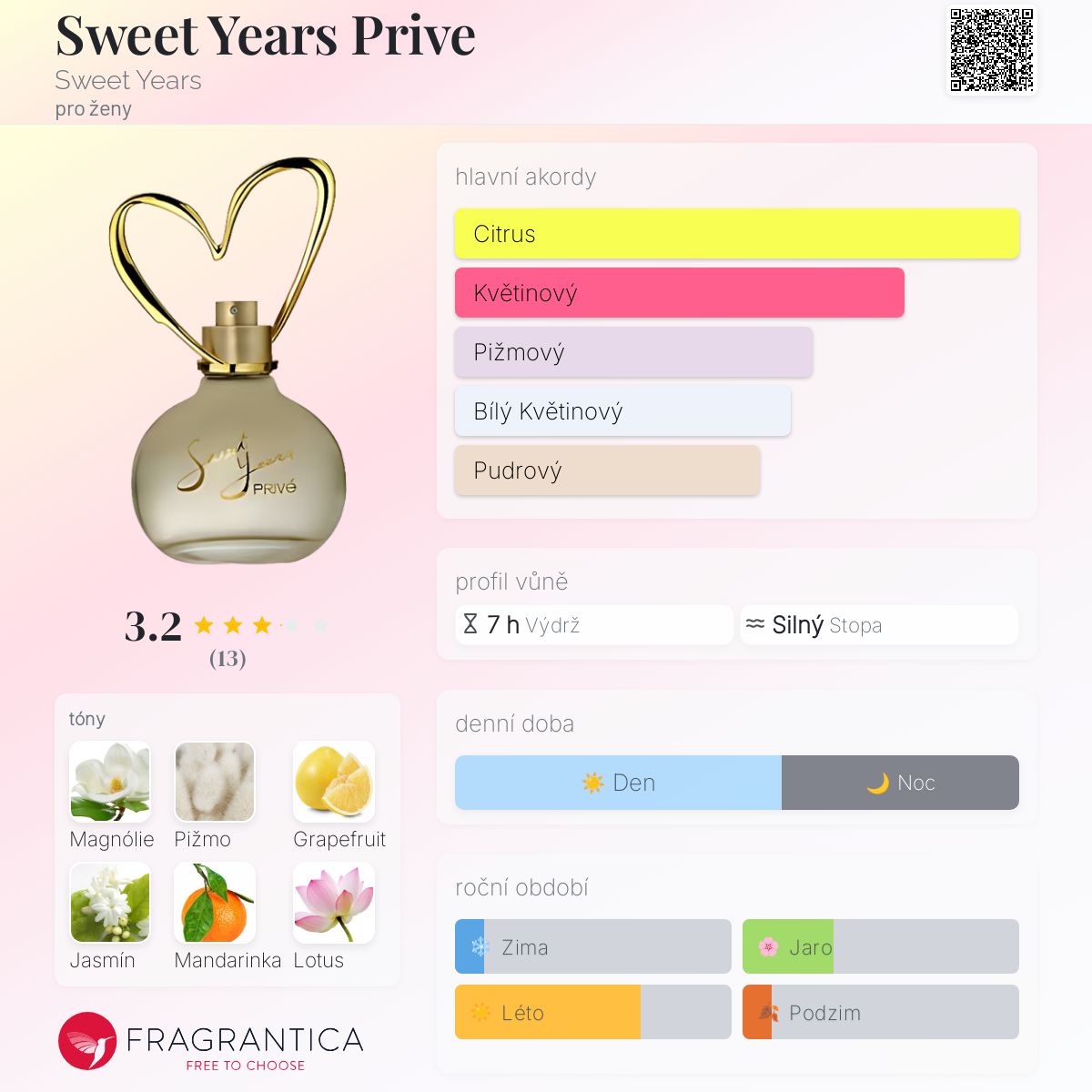 Sweet Years Prive podle Sweet Years je Floral Fruity vůně pro ženy. Sweet Years Prive byl/a uveden/a v roce 2007. Vrchní tóny jsou Grapefruit, Mandarinka, Pomeranč a Citrón; střední tóny jsouMagnólie, Jasmín a Lotus ; základní tóny jsou Pižmo, Cedr a Santalové dřevo.