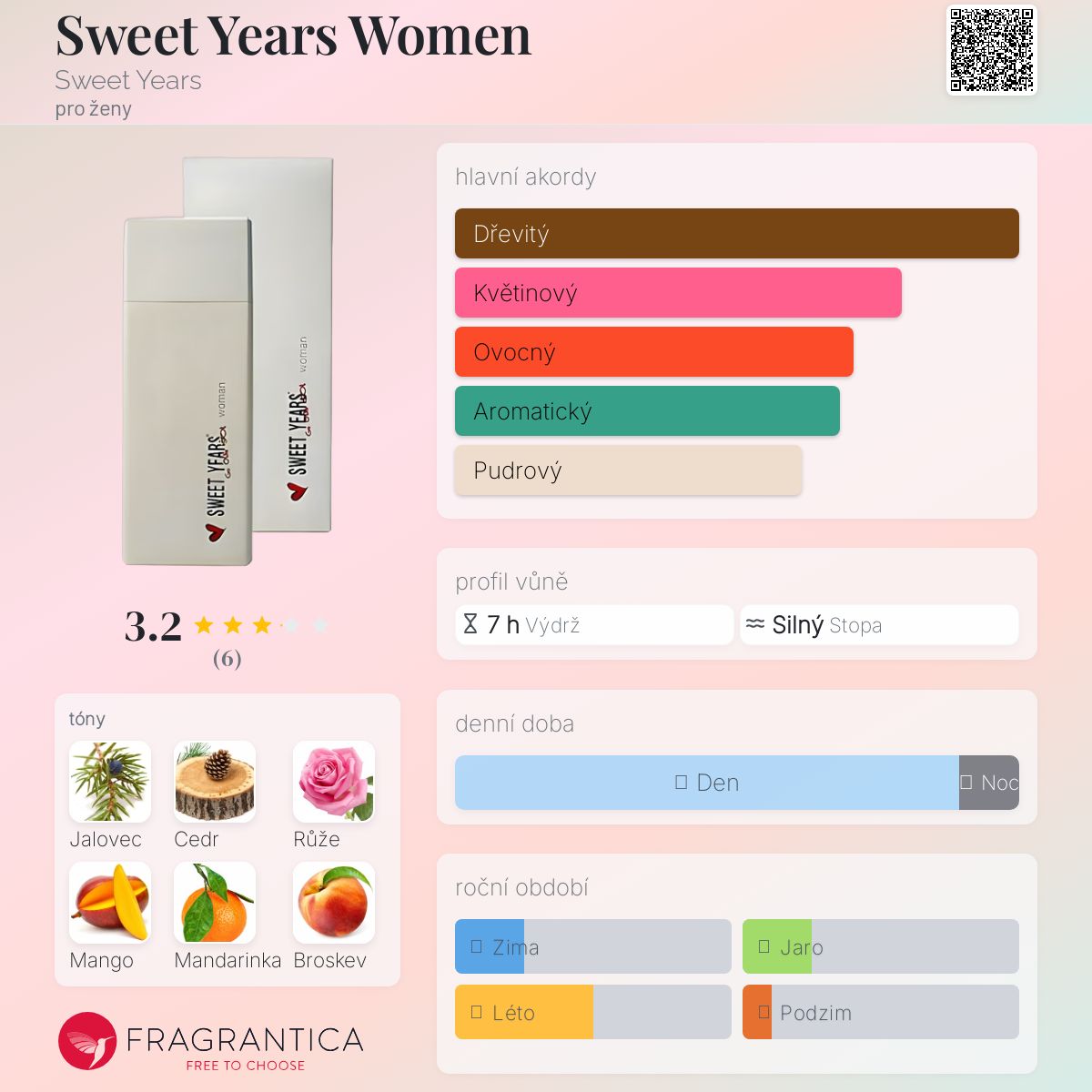 Sweet Years Women podle Sweet Years je Floral vůně pro ženy. Vrchní tóny jsou Jalovec, Růže, Mango, Mandarinka a Broskev; střední tóny jsouFrézie, Jasmín, Vonokvětka a Leknín ; základní tóny jsou Cedr, Jantar (ambra), Pižmo, Santalové dřevo a Pačuli.