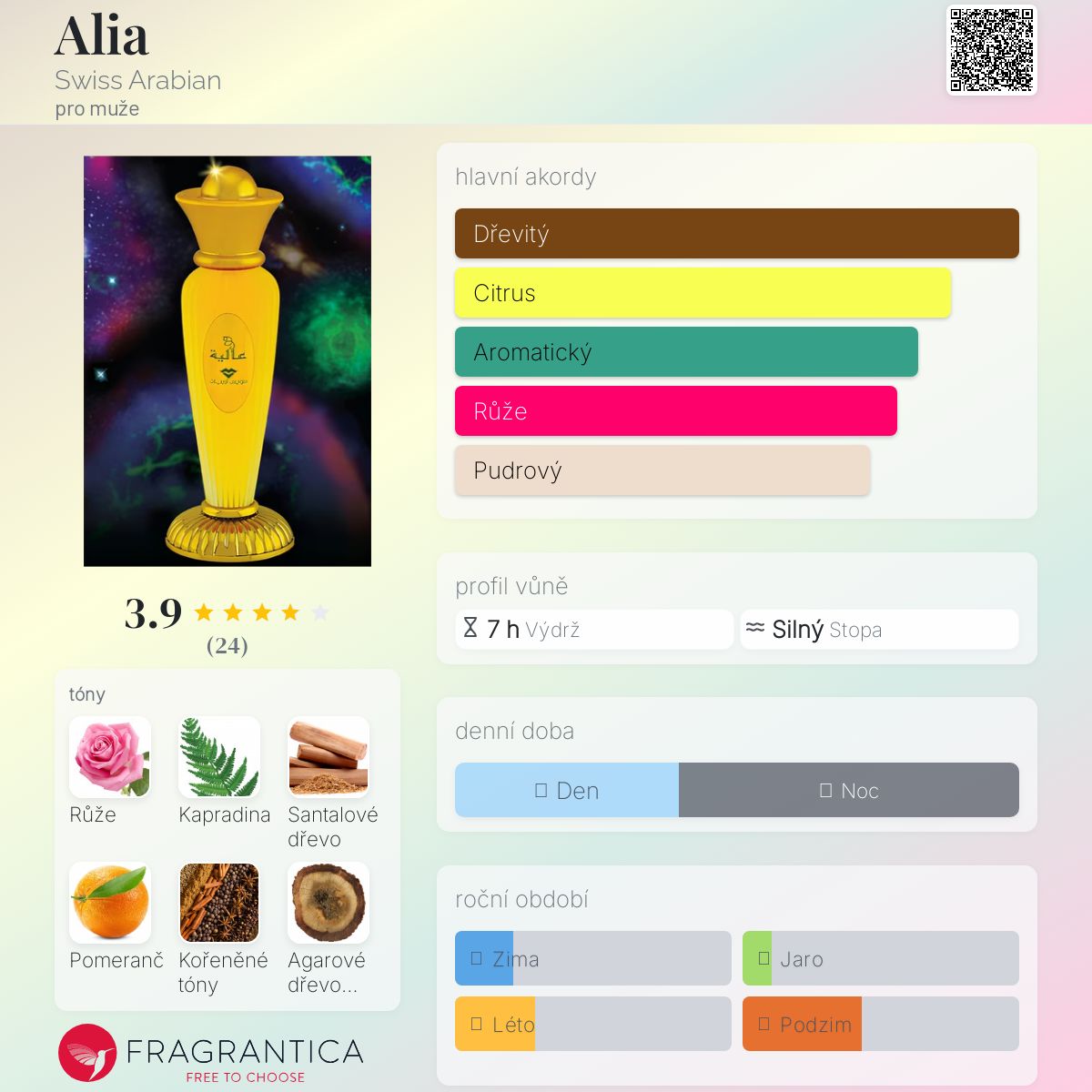 Alia podle Swiss Arabian je Woody Floral Musk vůně pro muže. Vrchní tóny jsou Pomeranč a Citron amalfi; střední tóny jsouRůže, Kapradina, Kořeněné tóny a Jasmín ; základní tóny jsou Santalové dřevo, Agarové dřevo (oud), Pižmo a Cedr.