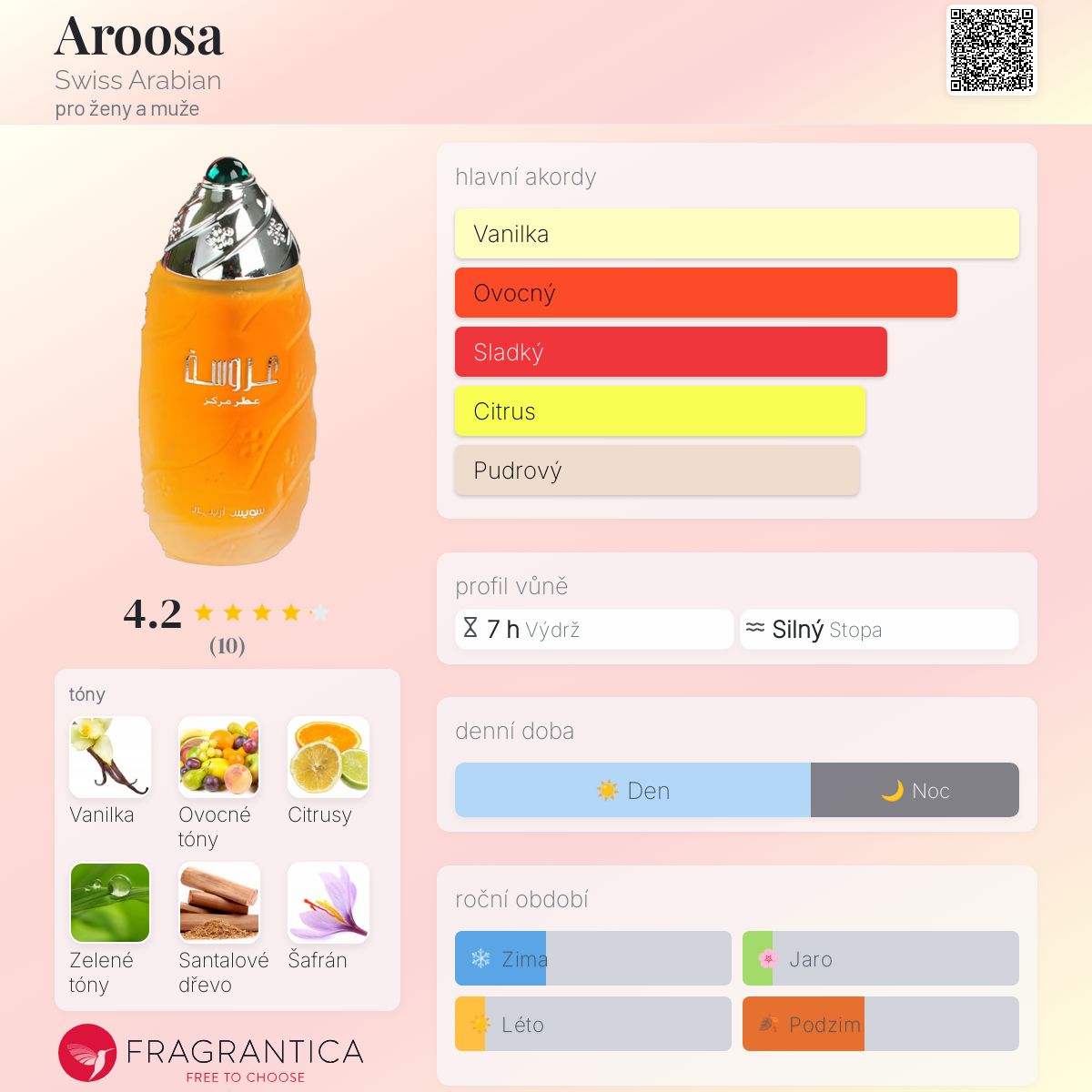 Aroosa podle Swiss Arabian je Floral Fruity Gourmand vůně pro ženy a muže. Vrchní tóny jsou Citrusy a Zelené tóny; střední tón jeKvětinové ovocné tóny ; základní tóny jsou Vanilka, Santalové dřevo a Šafrán.