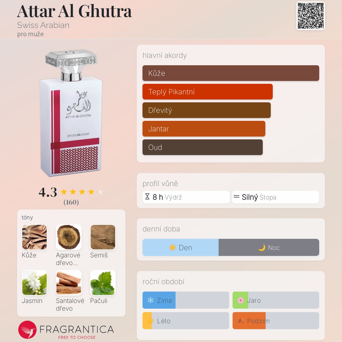 Attar Al Ghutra podle Swiss Arabian je Leather vůně pro muže. Attar Al Ghutra byl/a uveden/a v roce 2013. Vrchní tóny jsou Agarové dřevo (oud), Šafrán, Maliny, Mandarinka, Bergamot a Tymián; střední tóny jsouAgarové dřevo (oud), Jasmín, Pačuli, Olibanum a Růže ; základní tóny jsou Kůže, Agarové dřevo (oud), Semiš, Santalové dřevo a Jantar (ambra).