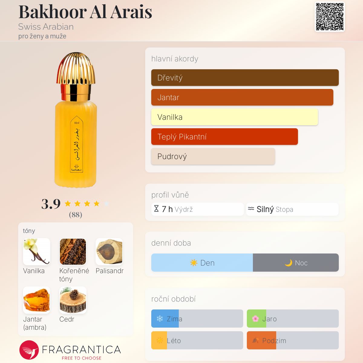 Bakhoor Al Arais podle Swiss Arabian je Orientální Woody vůně pro ženy a muže. Bakhoor Al Arais byl/a uveden/a v roce 2012. Vrchní tóny jsou Vanilka a Kořeněné tóny; střední tóny jsouKořeněné tóny a Cedr ; základní tóny jsou Palisandr a Jantar (ambra).