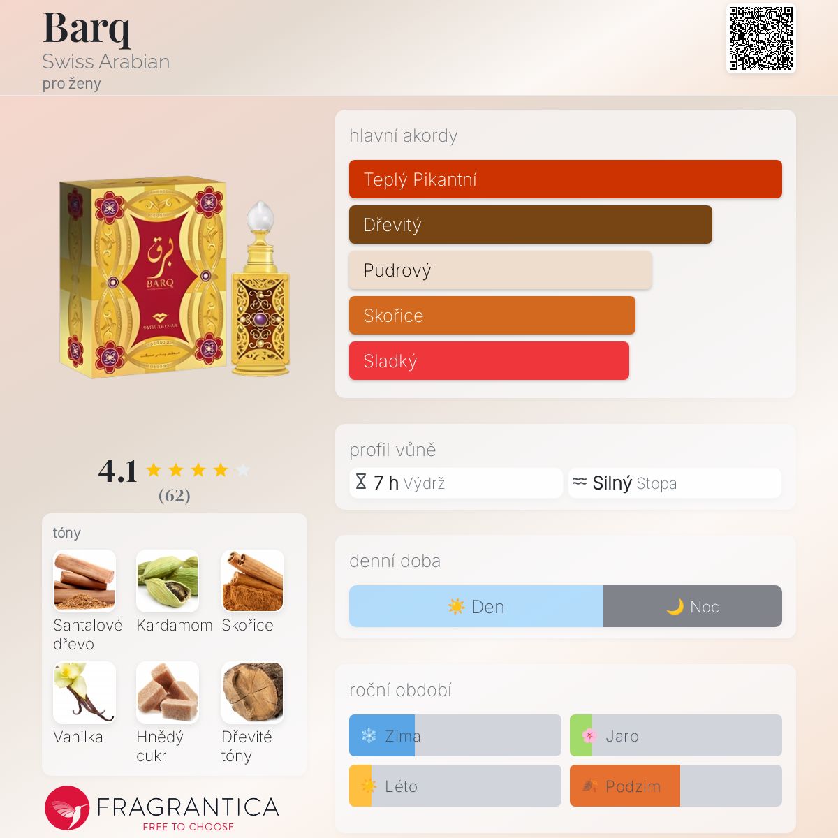 Barq podle Swiss Arabian je Orientální Vanilla vůně pro ženy. Vrchní tóny jsou Kardamom, Skořice, Mandarinka a Pomeranč; střední tóny jsouBílé dřevo a Růže ; základní tóny jsou Santalové dřevo, Vanilka, Hnědý cukr, Pižmo a Jantar (ambra).