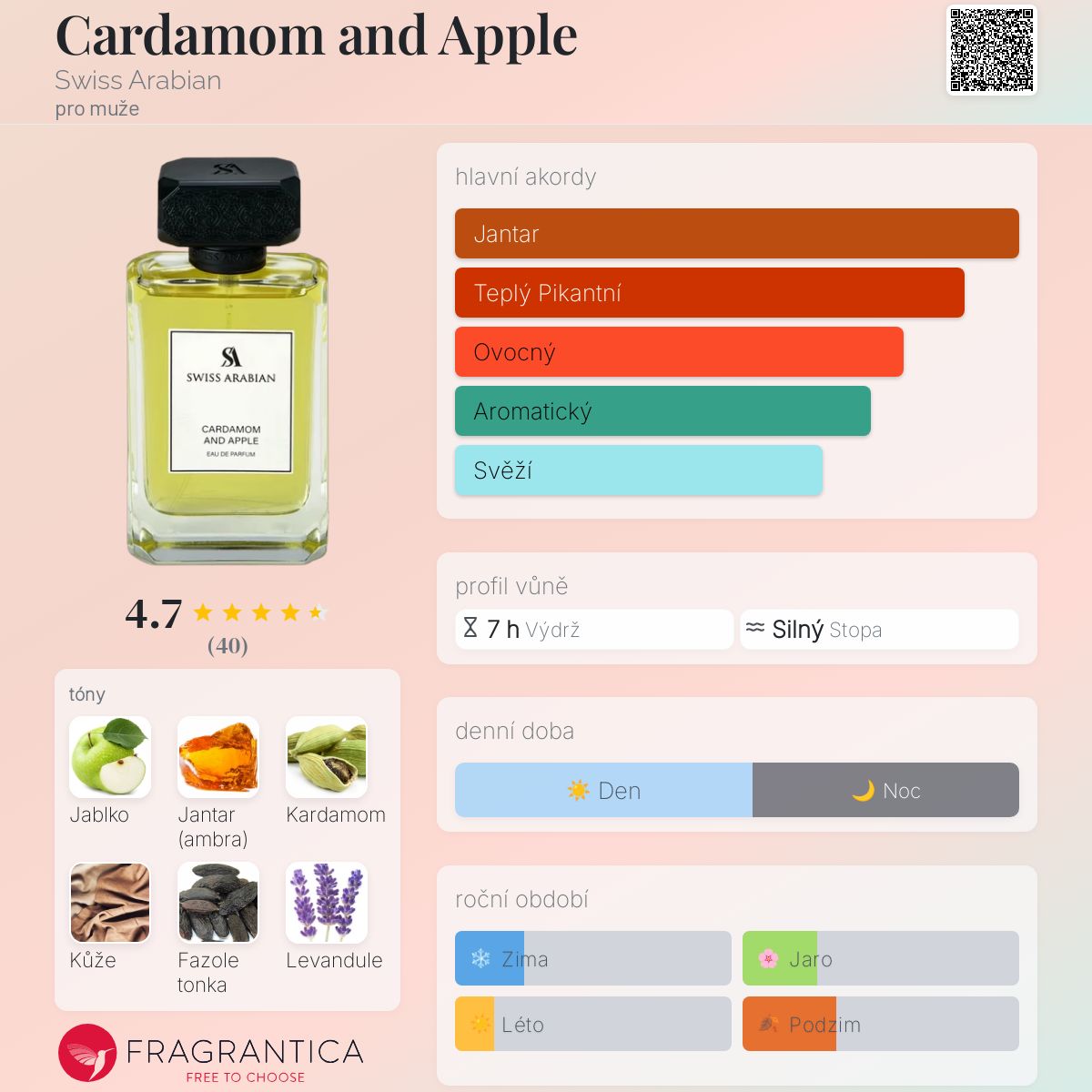 Cardamom and Apple podle Swiss Arabian je Orientální Spicy vůně pro muže. Toto je nová vůně. Cardamom and Apple byl/a uveden/a v roce 2024. Vrchní tóny jsou Zelené jablko, Kardamom a Zelená mandarinka; střední tóny jsouLevandule, Pomerančový květ a Muškátový oříšek ; základní tóny jsou Jantar (ambra), Kůže a Fazole tonka.