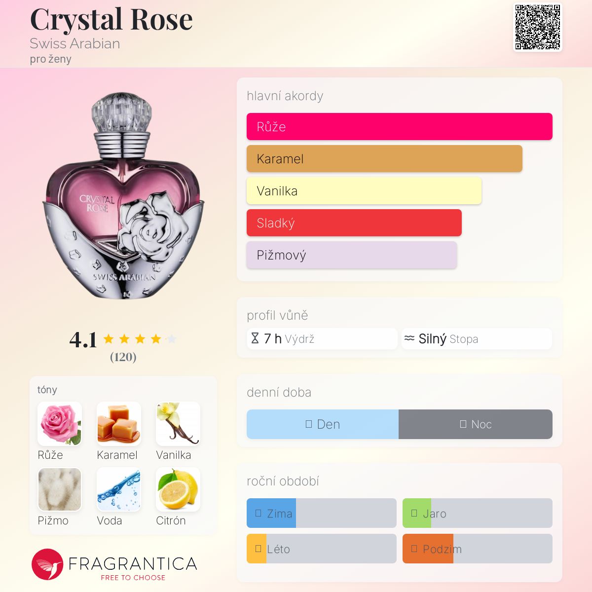 Crystal Rose podle Swiss Arabian je Floral vůně pro ženy. Crystal Rose byl/a uveden/a v roce 2018. Vrchní tóny jsou Vodní tóny a Citrón; střední tóny jsouRůže a Karamel ; základní tóny jsou Vanilka, Bílé pižmo a Cedr.