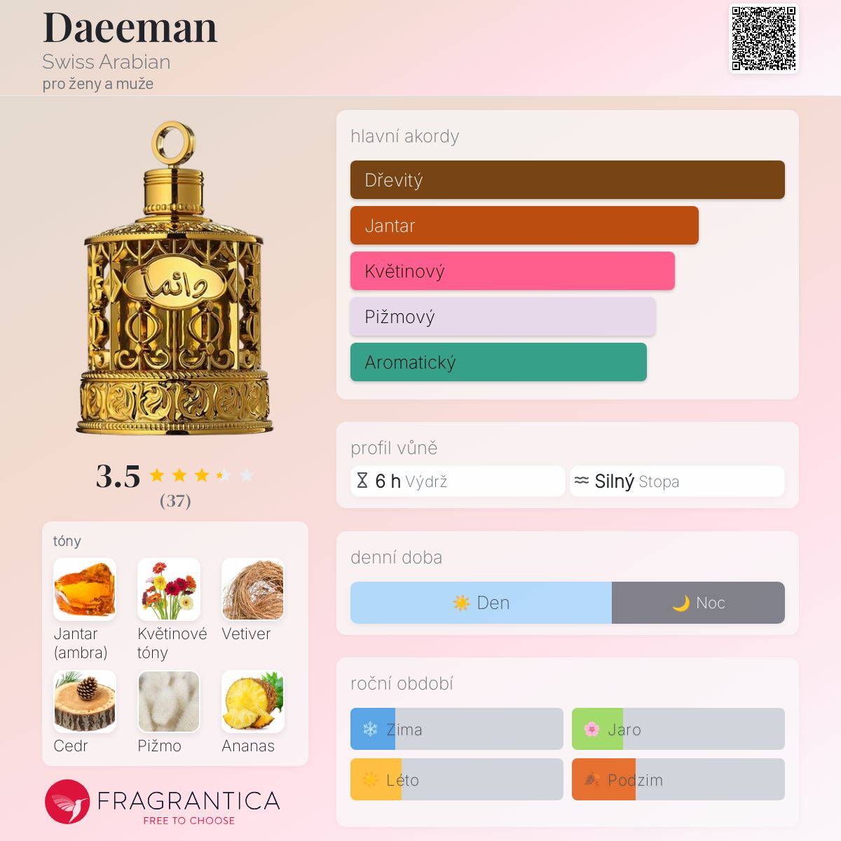 Daeeman podle Swiss Arabian je Woody Floral Musk vůně pro ženy a muže. Vrchní tóny jsou Květinové tóny, Ananas a Bergamot; střední tóny jsouVetiver a Pačuli ; základní tóny jsou Jantar (ambra), Cedr a Pižmo.