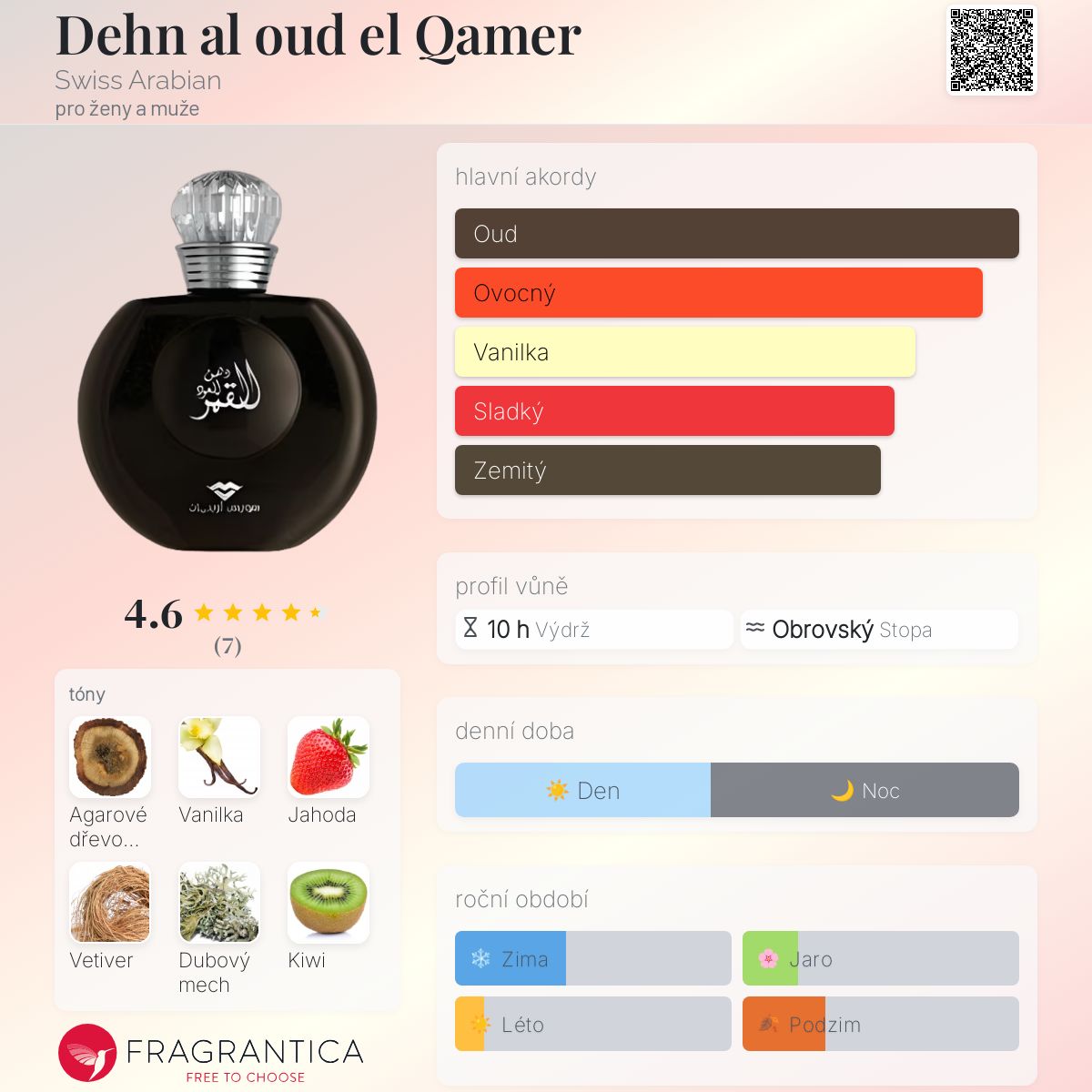 Dehn al oud el Qamer podle Swiss Arabian je Orientální vůně pro ženy a muže. Vrchní tóny jsou Agarové dřevo (oud), Vanilka, Velká jahoda a Kiwi; střední tón jeAgarové dřevo (oud) ; základní tóny jsou Agarové dřevo (oud), Vetiver a Dubový mech.