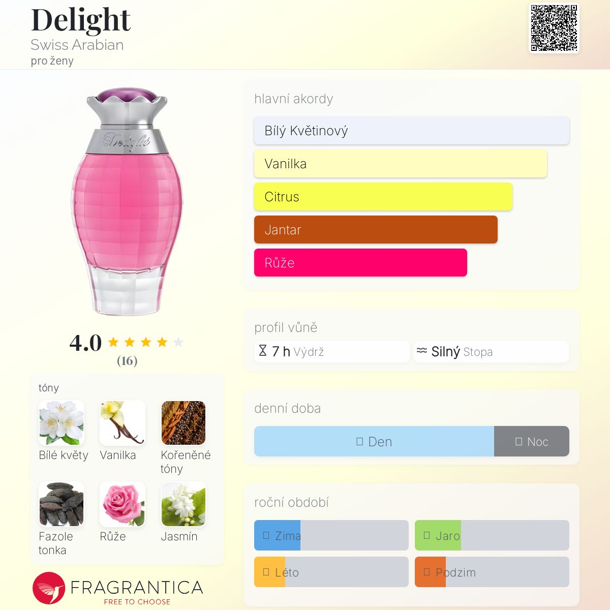 Delight podle Swiss Arabian je Floral vůně pro ženy. Vrchní tóny jsou Kořeněné tóny, Mandarinka a Bergamot; střední tóny jsouBílé květy, Růže a Jasmín ; základní tóny jsou Vanilka, Fazole tonka, Bílý jantar (ambra) a Bílé pižmo.