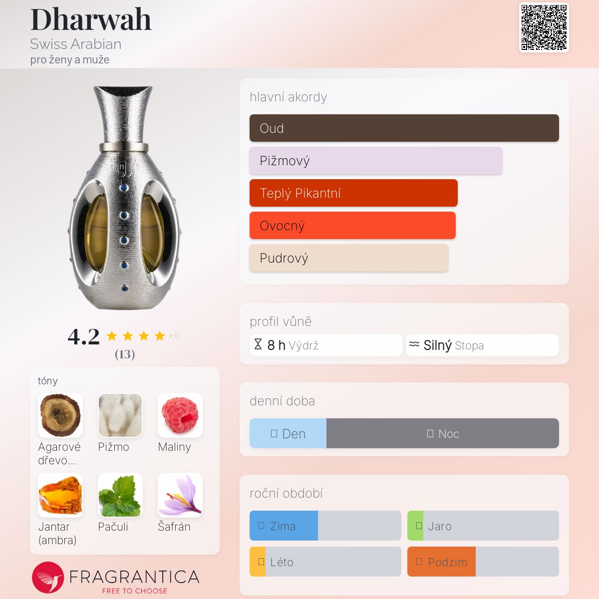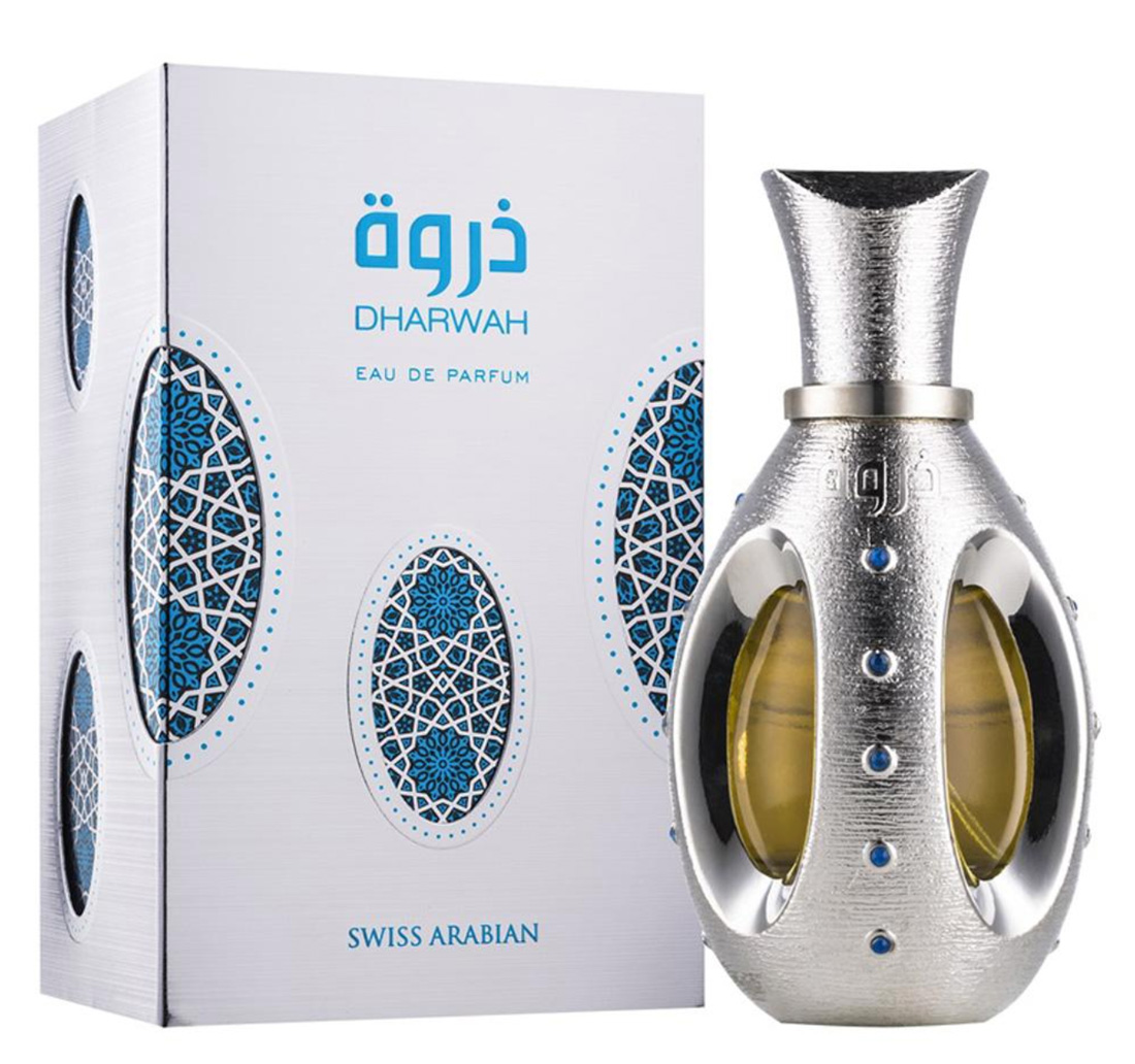 Dharwah podle Swiss Arabian je vůně pro ženy a muže. Vrchní tóny jsou Maliny, Šafrán a Hruška; střední tóny jsouAgarové dřevo (oud), Růže a Neroli ; základní tóny jsou Agarové dřevo (oud), Pižmo, Jantar (ambra) a Pačuli.