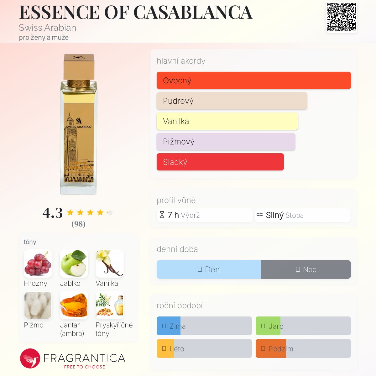 ESSENCE OF CASABLANCA podle Swiss Arabian je Orientální Woody vůně pro ženy a muže. ESSENCE OF CASABLANCA byl/a uveden/a v roce 2023. "Nosem" za touto vůní je Isabel Gil Trujillo. Vrchní tóny jsou Hrozny a Jablko; střední tóny jsouPačuli a Orris ; základní tóny jsou Vanilka, Pižmo, Jantar (ambra) a Pryskyřičné tóny.