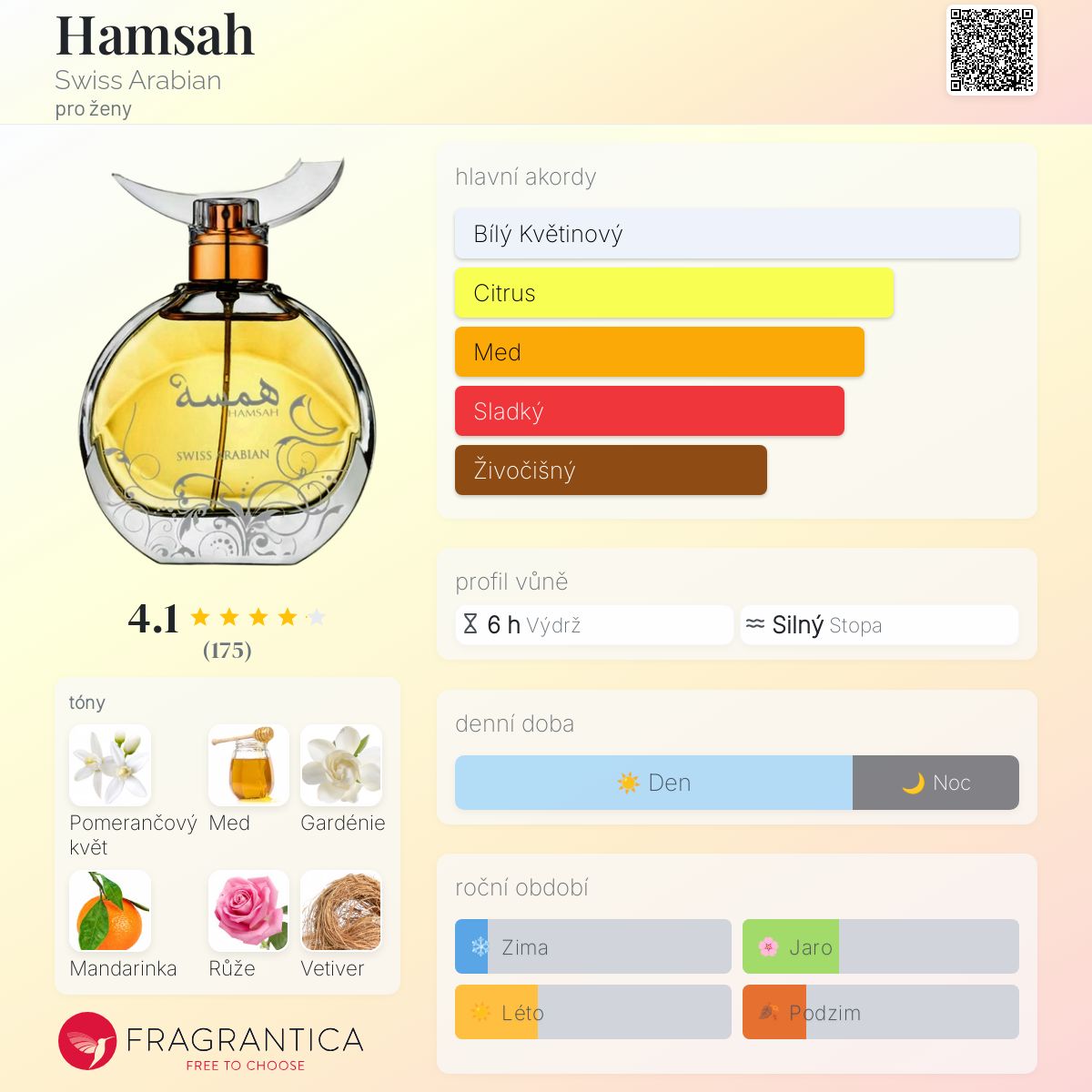 Hamsah podle Swiss Arabian je Floral Woody Musk vůně pro ženy. Vrchní tón je Pomerančový květ ; střední tóny jsouGardénie a Mandarinka ; základní tóny jsou Med, Růže a Vetiver.