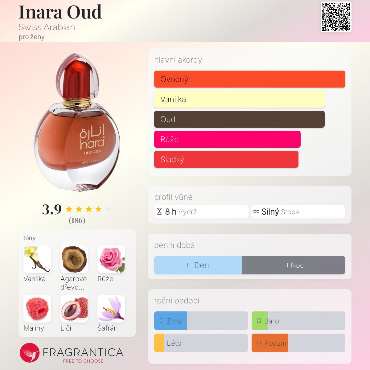 Inara Oud podle Swiss Arabian je Orientální vůně pro ženy. Vrchní tóny jsou Liči, Šafrán a Kozlík lékařský; střední tóny jsouRůže, Maliny a Broskev ; základní tóny jsou Vanilka, Agarové dřevo (oud) a Týkové dřevo.