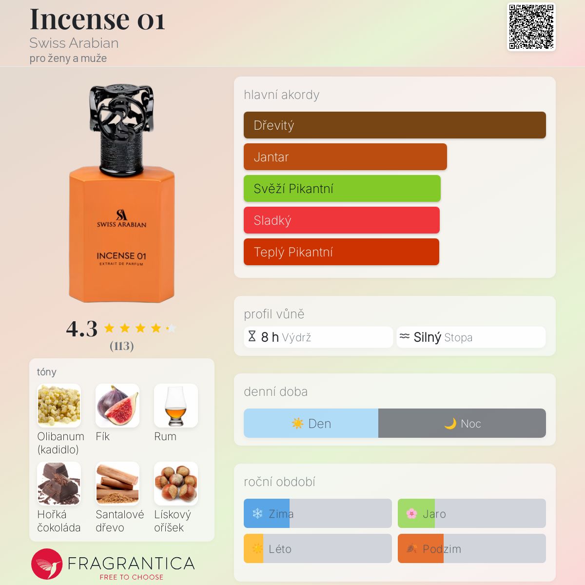 Incense 01 podle Swiss Arabian je Woody Spicy vůně pro ženy a muže. Toto je nová vůně. Incense 01 byl/a uveden/a v roce 2025. Vrchní tóny jsou Kadidlo, Rum, Jalovec a Bergamot; střední tóny jsouFík, Lískový oříšek, Pražené ořechy, Mandle a Konvalinka ; základní tóny jsou Kadidlo, Hořká čokoláda, Santalové dřevo, Vanilka, Cedr a Mech.