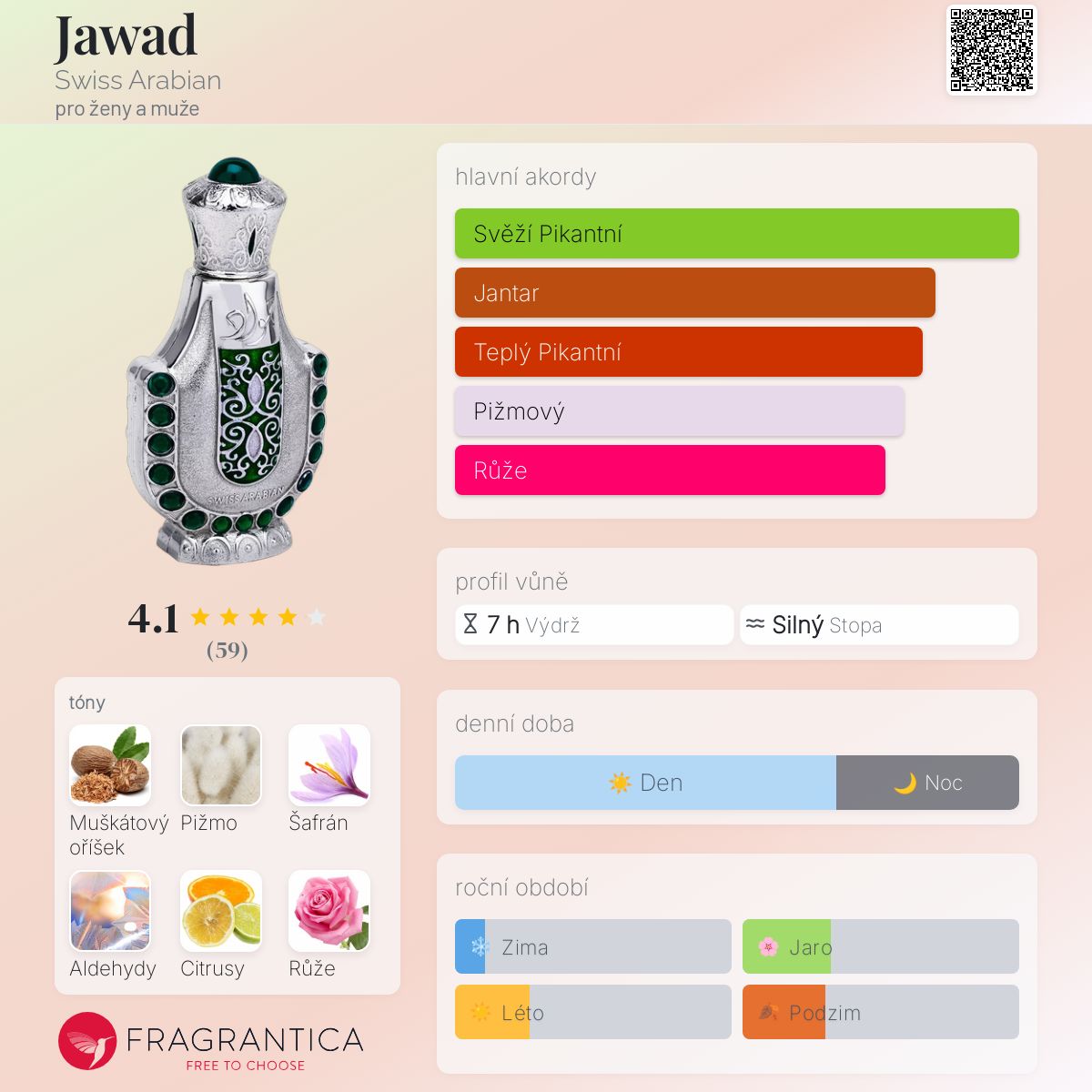 Jawad podle Swiss Arabian je Orientální vůně pro ženy a muže. Vrchní tóny jsou Šafrán, Aldehydy, Citrusy a Růže; střední tóny jsouMuškátový oříšek, Pelargónie a Otočník ; základní tóny jsou Pižmo, Pačuli, Ambra a Labdanum.