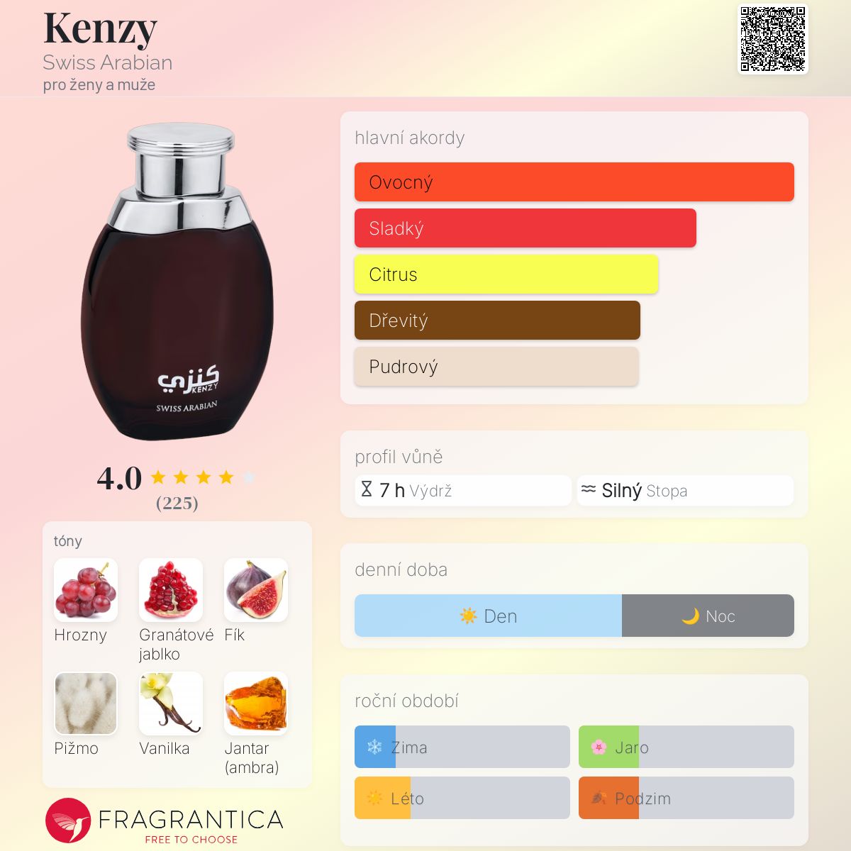 Kenzy podle Swiss Arabian je vůně pro ženy a muže. Vrchní tóny jsou Pomeranč, Bergamot a Citrón; střední tóny jsouHrozny, Granátové jablko, Fík a Meruňka ; základní tóny jsou Pižmo, Vanilka a Jantar (ambra).