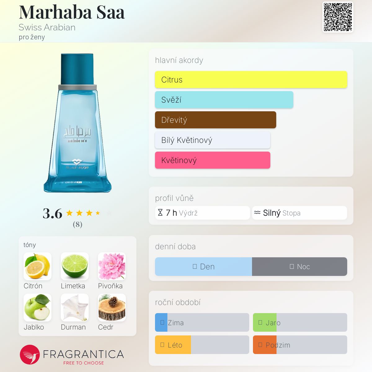 Marhaba Saa podle Swiss Arabian je Floral Fruity vůně pro ženy. Vrchní tóny jsou Citrón a Limetka; střední tóny jsouPivoňka, Zelené jablko a Durman ; základní tóny jsou Cedr, Vanilka a Pižmo.