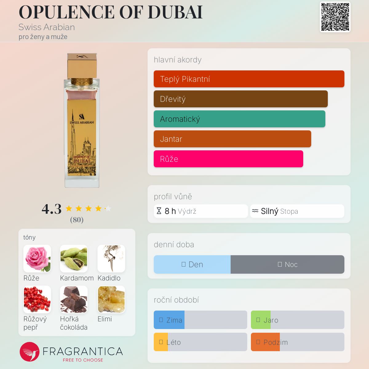 OPULENCE OF DUBAI podle Swiss Arabian je Woody Spicy vůně pro ženy a muže. OPULENCE OF DUBAI byl/a uveden/a v roce 2023. "Nosem" za touto vůní je Ilias Ermenidis. Vrchní tóny jsou Elimi, Nigerijský zázvor a Kalábrijský bergamot; střední tóny jsouDamašská růže, Kardamom, Růžový pepř a Čokoláda ; základní tóny jsou Kadidlo, Cypriolový olej, Atlasový cedr, Bourbonská vanilka, Jantar (ambra), Vetiver a Pražená kávová zrna.