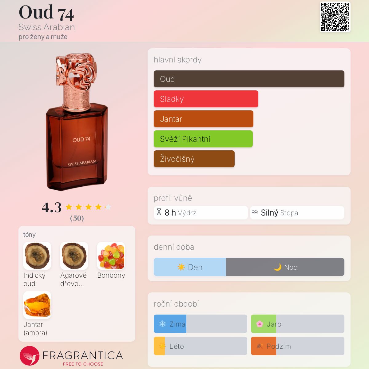 Oud 74 podle Swiss Arabian je Woody vůně pro ženy a muže. Oud 74 byl/a uveden/a v roce 2021. Vrchní tón je Indický oud ; střední tóny jsouIndický oud a Agarové dřevo (oud) ; základní tóny jsou Indický oud, Sladké tóny a Jantar (ambra).