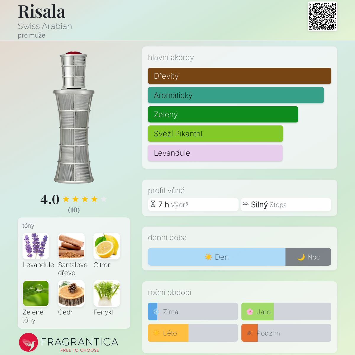 Risala podle Swiss Arabian je Aromatic Fougere vůně pro muže. Vrchní tóny jsou Citrón, Zelené listí, Tymián, Rozmarýn a Máta; střední tóny jsouLevandule, Cedr a Fenykl ; základní tóny jsou Santalové dřevo a Seno.