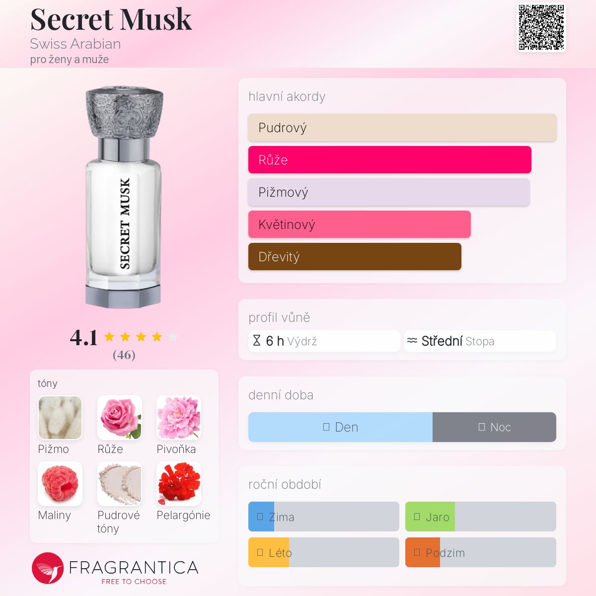 Secret Musk podle Swiss Arabian je Floral vůně pro ženy a muže. Vrchní tóny jsou Pivoňka a Pelargónie; střední tóny jsouBílé pižmo, Bílá růže, Maliny a Kosatec ; základní tóny jsou Pižmo, Pudrové tóny, Kašmírové dřevo a Santalové dřevo.