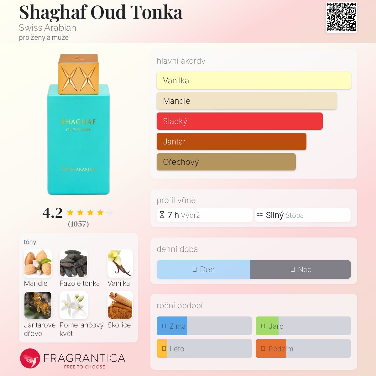 Shaghaf Oud Tonka podle Swiss Arabian je Orientální Vanilla vůně pro ženy a muže. Shaghaf Oud Tonka byl/a uveden/a v roce 2023. Vrchní tón je Mandle ; střední tóny jsouTuniský pomerančový květ, Skořice a Turecká růže ; základní tóny jsou Fazole tonka, Vanilka a Jantarové dřevo.