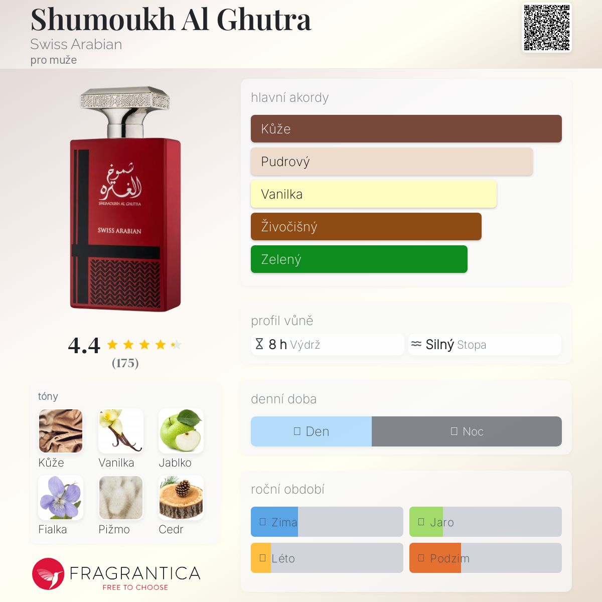 Shumoukh Al Ghutra podle Swiss Arabian je Leather vůně pro muže. Vrchní tóny jsou Jablko, Fialka a Galbanum; střední tóny jsouKůže a Cedr ; základní tóny jsou Vanilka a Pižmo.