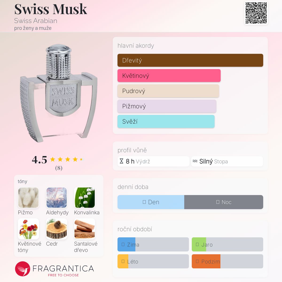 Swiss Musk podle Swiss Arabian je Aromatic vůně pro ženy a muže. Vrchní tóny jsou Aldehydy, Konvalinka a Broskev; střední tóny jsouKvětinové tóny, Růže, Pelargónie a Ylang-Ylang ; základní tóny jsou Pižmo, Cedr, Santalové dřevo a Dřevité tóny.