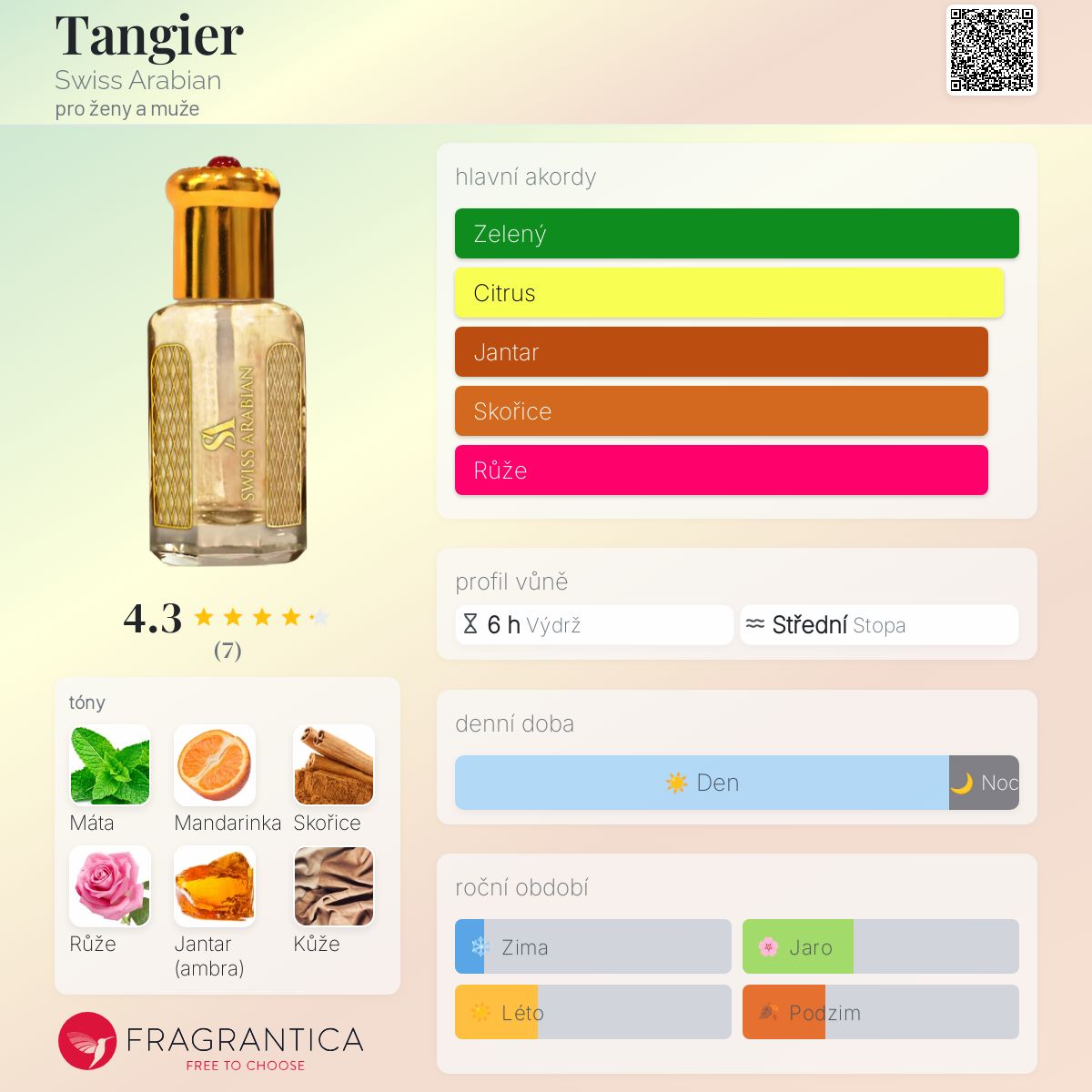 Tangier podle Swiss Arabian je Aromatic vůně pro ženy a muže. Tangier byl/a uveden/a v roce 2019. Vrchní tóny jsou Máta a Mandarinka; střední tóny jsouSkořice a Růže ; základní tóny jsou Jantar (ambra) a Kůže.