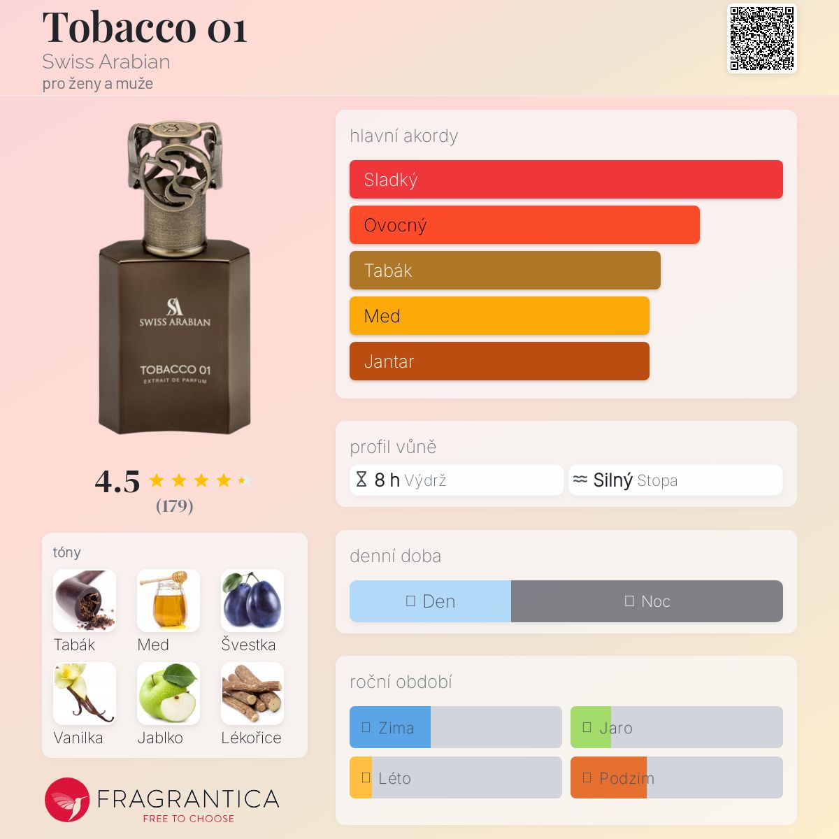 Tobacco 01 podle Swiss Arabian je Orientální Spicy vůně pro ženy a muže. Toto je nová vůně. Tobacco 01 byl/a uveden/a v roce 2024. "Nosem" za touto vůní je Angéline Leporini. Vrchní tóny jsou Švestka, Jablko, Lékořice, Kmín a Růžový pepř; střední tóny jsouLabdanum, Jantar (ambra), Pačuli a Ylang-Ylang ; základní tóny jsou Tabák, Med, Vanilka, Santalové dřevo, Pižmo a Kašmírové dřevo.