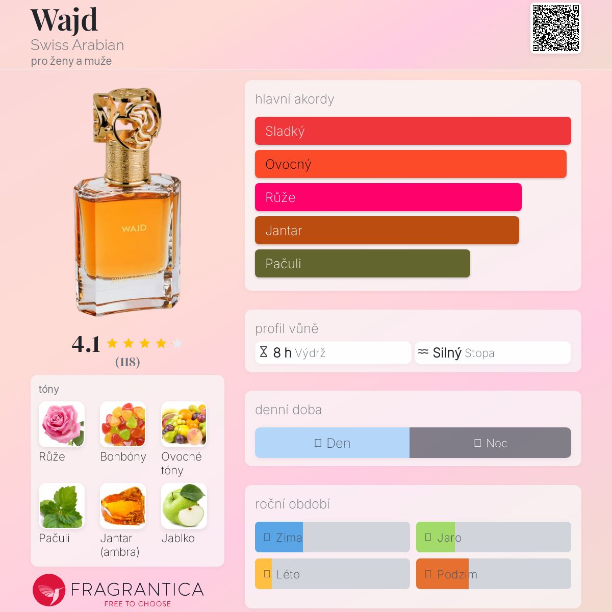 Wajd podle Swiss Arabian je Floral Fruity vůně pro ženy a muže. Wajd byl/a uveden/a v roce 2021. Vrchní tóny jsou Turecká růže, Ovocné tóny a Jablko; střední tóny jsouPačuli a Kořen orris ; základní tóny jsou Sladké tóny, Jantar (ambra), Pryskyřice a Pižmo.