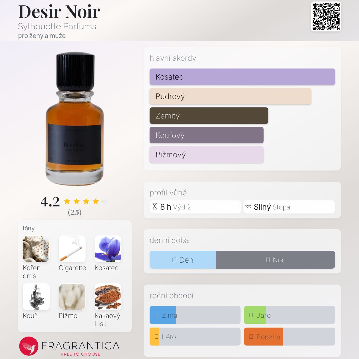 Desir Noir podle Sylhouette Parfums je Orientální Woody vůně pro ženy a muže. Toto je nová vůně. Desir Noir byl/a uveden/a v roce 2024. "Nosem" za touto vůní je Sy Truong.