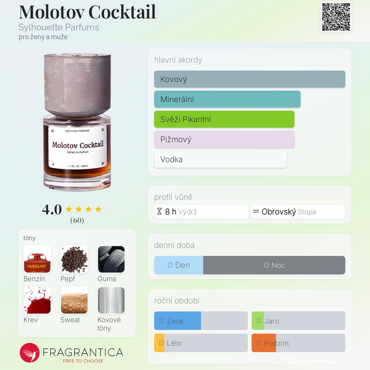 Molotov Cocktail podle Sylhouette Parfums je Aromatic Spicy vůně pro ženy a muže. Molotov Cocktail byl/a uveden/a v roce 2023. "Nosem" za touto vůní je Sy Truong. Vrchní tóny jsou Benzín, Pepř a Vodka; střední tóny jsouGuma, Krev a Pot ; základní tóny jsou Kovové tóny, Pižmo, Jód a Kůže.