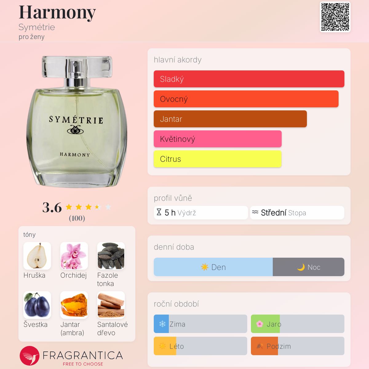 Harmony podle Symétrie je Floral Fruity vůně pro ženy. Harmony byl/a uveden/a v roce 2017. Vrchní tóny jsou Hruška, Bergamot a Růžový grapefruit; střední tóny jsouVanilková orchidej, Švestka a Jasmín ; základní tóny jsou Fazole tonka, Jantar (ambra) a Santalové dřevo.